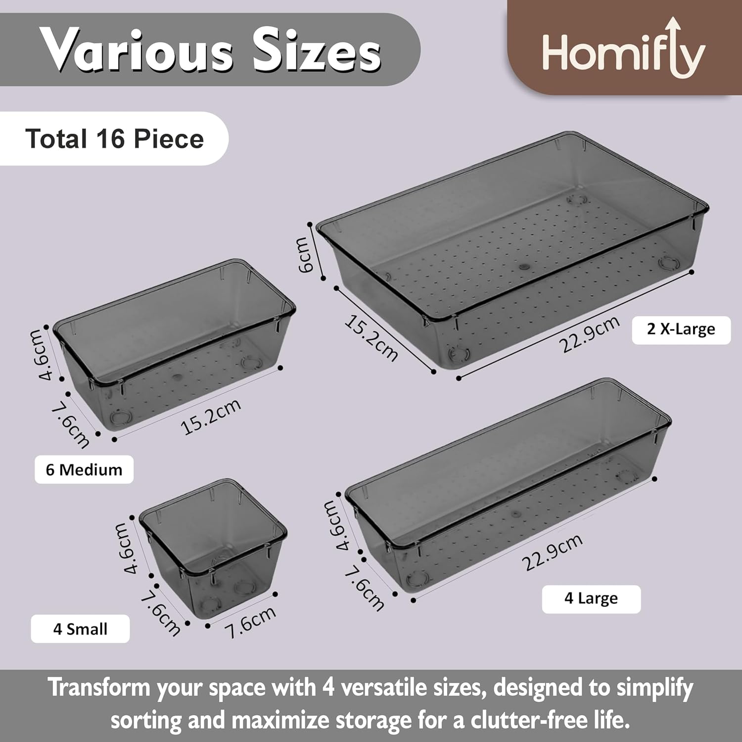 𝐒𝐞𝐭 𝐨𝐟 𝟏𝟔 𝐟𝐨𝐫 𝐁𝐞𝐭𝐭𝐞𝐫 𝐎𝐫𝐠𝐚𝐧𝐢𝐳𝐚𝐭𝐢𝐨𝐧: Revolutionize your storage with 16 expertly crafted Drawers Tray in practical sizes: 3 x 6 x 2 inches (6 pcs), 9 x 6 x 2 inches (2 pcs), 3 x 3 x 2 inches (4 pcs), and 3 x 9 x 2 inches (4 pcs). Designed for ultimate flexibility, these organizers can be mixed and matched to create a fully customized drawer organization system that adapts to your unique needs.