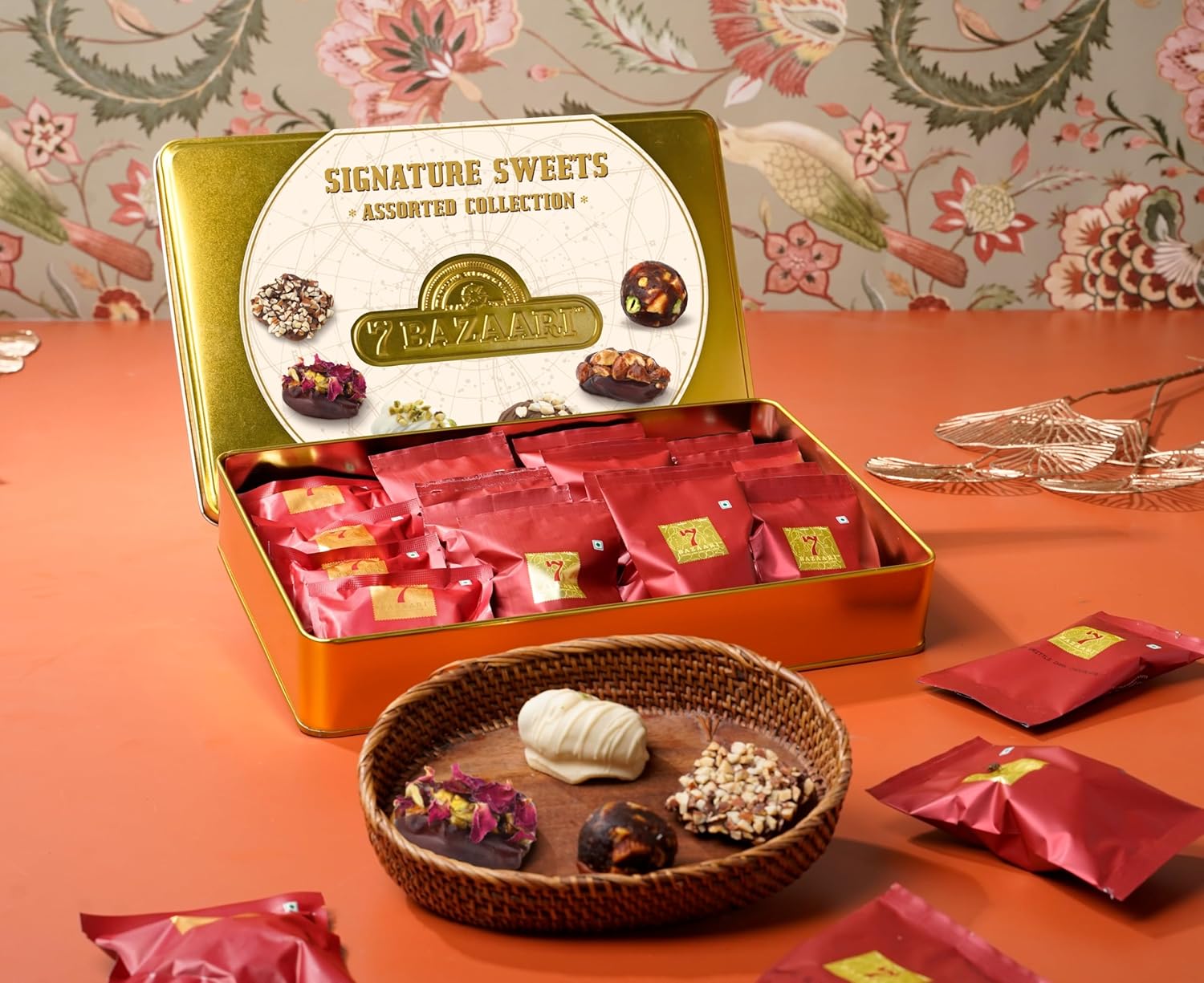 This box includes: Sweet Treat Tin Box (16pieces): 1. Almond Snapper 3pcs 2. Pistachio rose stuffed date 3pcs 3. Almond honey Stuffed Date 3pcs 4. Date & nut globe 2pcs 5. Cashew Milk chocolate coated date 3pcs 6. Pistachio white chocolate coated date 2pcs 7. Rakhi