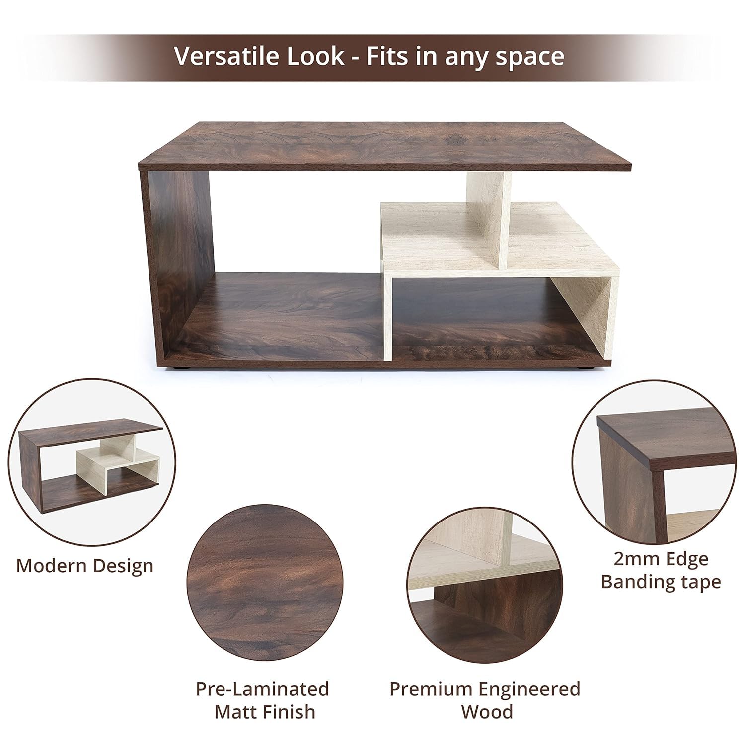 Modern Contemporary Design: This centre table comes flat packed which is built up of engineered wood with modern contemporary design and pre-laminated matte finish that is durable and long-lasting. It comes in S shaped and has 4 semi closed compartments to store and grab your laptop for a movie, a fun board game or two, and even your tea set