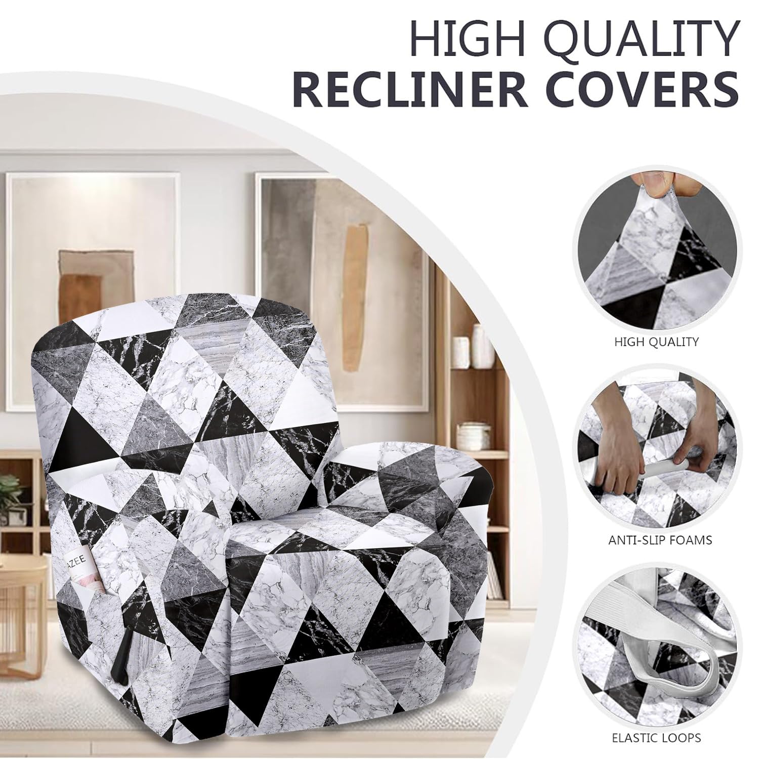 Amazon Brand – Umi Super Stretch Printed Recliner Cover Recliner Couch Covers Recliner Chair Cover Form Fitted Non Slip Reclining Slipcovers for Standard Large Recliner, Soft Thick, Grey-White