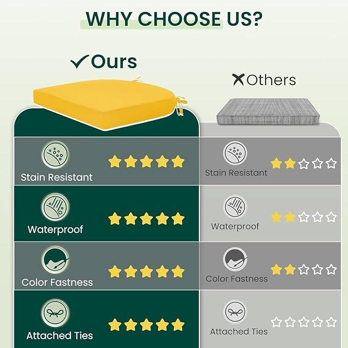 DURABLE POLYESTER FABRIC – Our waterproof cushions for outdoor furniture adopt high density polyester fabric that is UV-resistant, waterproof and anti-fading. Also, these outdoor patio cushions are super easy to maintain and clean, just gently wipe with a damp cloth and wait to dry.
