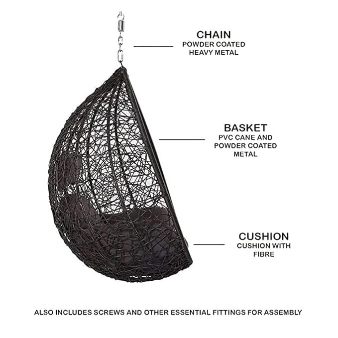 The ANAND INDIA GROUPS Hammock hanging chair features environmental simulation rattan PE material with hand woving process makes it casual,practical and super easy to clean. You would be amazed at how smooth the hammock swing is on the surface.The anti corrosion resistance, non-static,great flexibilty and no fading features even under the sun and rain offer the basket swing chair an incredible service life. Ergonomic Design:Exquisite and fashionable waving makes the Duzo wicker hammock chair very stylish. The eye-catching egg shape helps it a perfect addition to your house. The angles have been seriously tested to fit human body curve and to support the fatigue part, you will have a super pleasant time with this Duzo hanging swing chair anytime and anywhere. Multi Methods to Hang:The hanging chair for bedroom comes with stainless steel hardwares in the package including stainless steel pad-screw,spring snap hooks,expansion screws and ordinary screws, you can just hang it to the ceiling.Or you can order the Duzo hanging stand to have easier installation and better placement in your house. Perfect for Outdoor Use:This unique swing chair is a perfect addition to any outside space,like a backyard patio,deck,a sunroom or garden,near a pool or outdoor Bar.You would enjoy the time lying in the hammock chair listening to music,dringking some coffee,reading or just enjoying the leisure time in your backyard or along the swimming pool. Strong & Durable:- Heavy metal frame supports up to 1 people. Swing frame load up to 130 kg. Quality wicker and rattan weaving on swing and Easy-to-clean.
