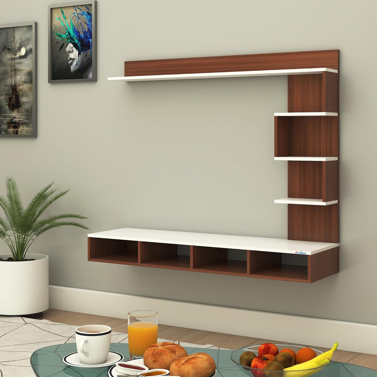 This tv entertainment unit is suitable for your living room and bedroom. Showcase and organize your tv wall unit or set-top box unit securely and make your home wall more beautiful. It is an easy installing compact shelf set for tv, set-top box, or gift items, that uses small space and gives your living room a standard & pleasant look.Give any room a dash of modern style with our wall mounted tv unit. The main shelf is providing ample space for your cable box, DVR or other media components. Cables are neatly concealed to give the console a professional, minimalist look.An eye catcher constructed in attractive contrasting color. Intellectually created in scratch resistant premium engineered wood with cabinet, shelves paving way for ample storage for your set up box, DVD, books, documents etc. It is versatile form and rich finish allows to blend effortlessly with the rest of your décor. Smooth edges, resistant to humidity with gorgeous aesthetics and functional storage utility.