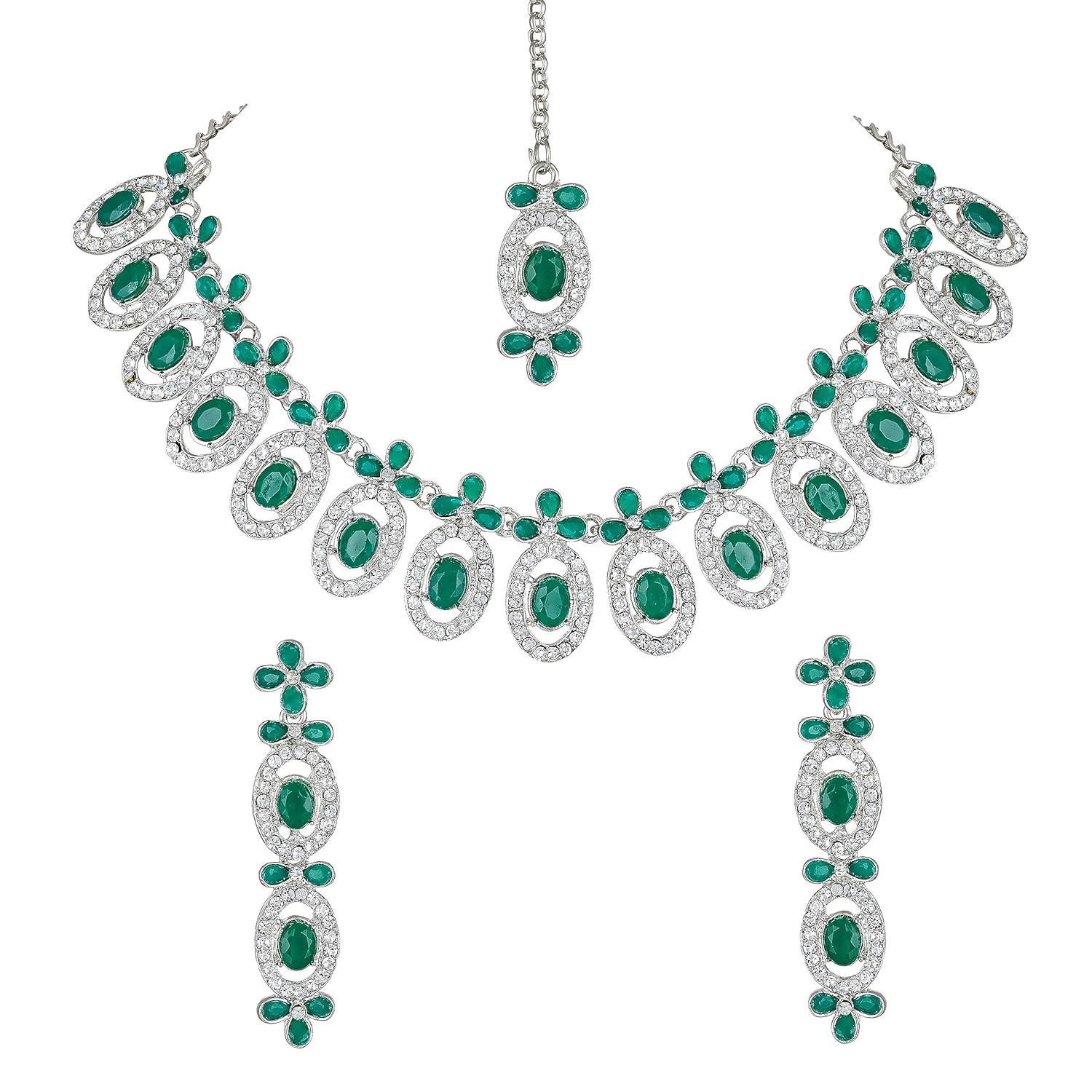 Atasi International brings to you a Mint Blue Crystals Diamond Necklace Jewellery Set which is a complete set that adds a finishing touch to your jewellery collection. This set consists of a necklace, matching earrings and a maang tikka, making it perfect for brides. Featuring exquisite craftsmanship, this silver-plated diamond necklace set is made using high-quality American diamonds that impart a hint of glamour to your attire. The intricate design of this necklace set features a stunning combination of silver and green elements that enhance your overall look.