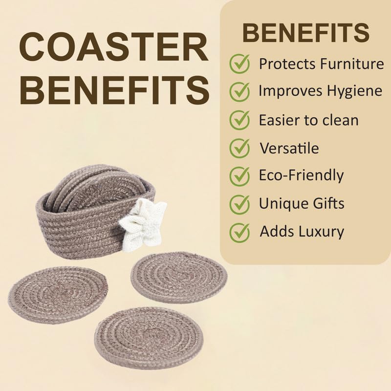 🌿 ECO-CONSCIOUS & SUSTAINABLE CHOICE: Set of 6 premium cotton rope drink coasters thoughtfully handcrafted for eco-friendly living. Made from natural cotton fibers, these reusable and biodegradable coasters help reduce plastic waste — a perfect addition for sustainable homes, cafes, and offices.