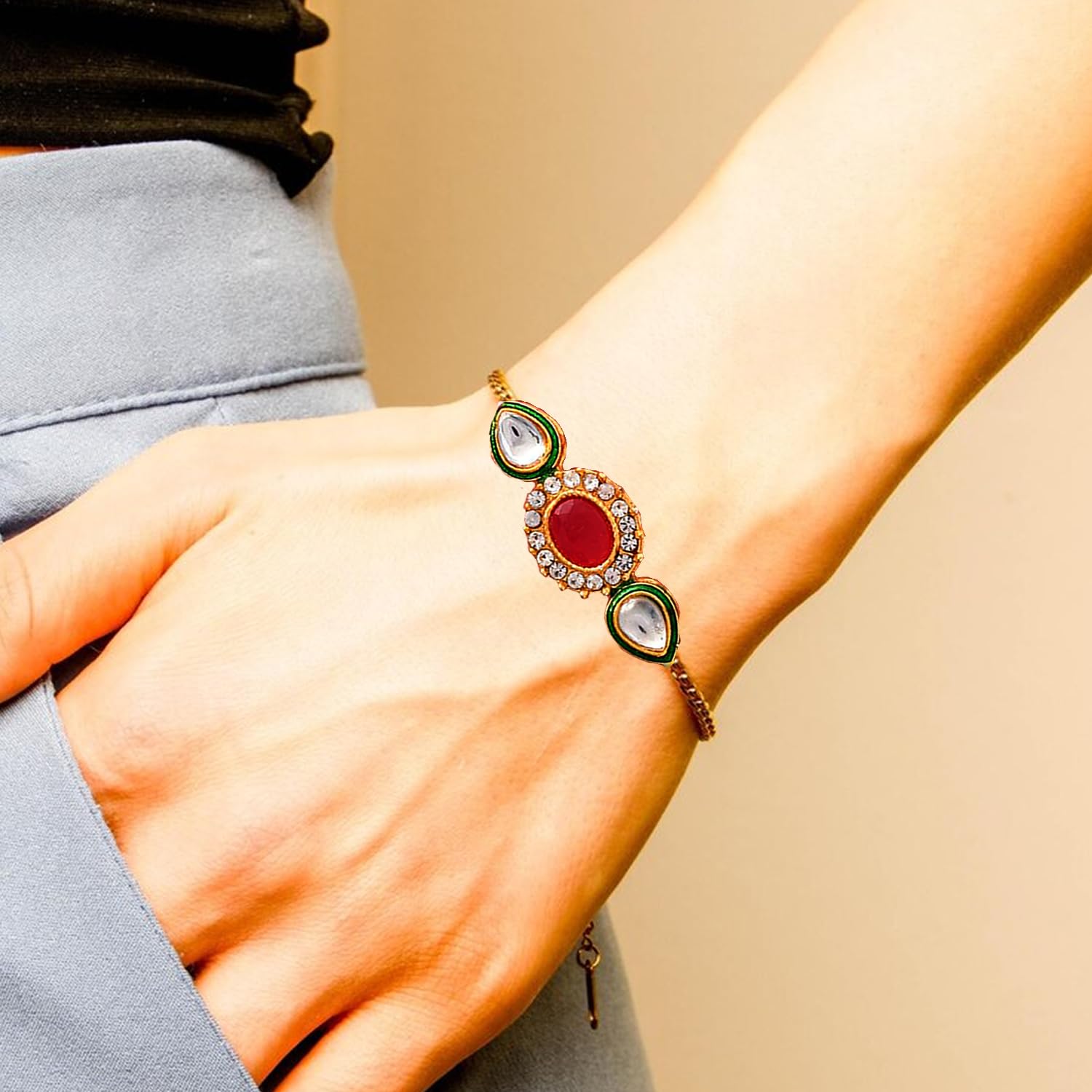 Elegant Kundan Rakhi: Intricately crafted Kundan Rakhi with a traditional yet stylish design, perfect for celebrating the sacred bond of Raksha Bandhan.