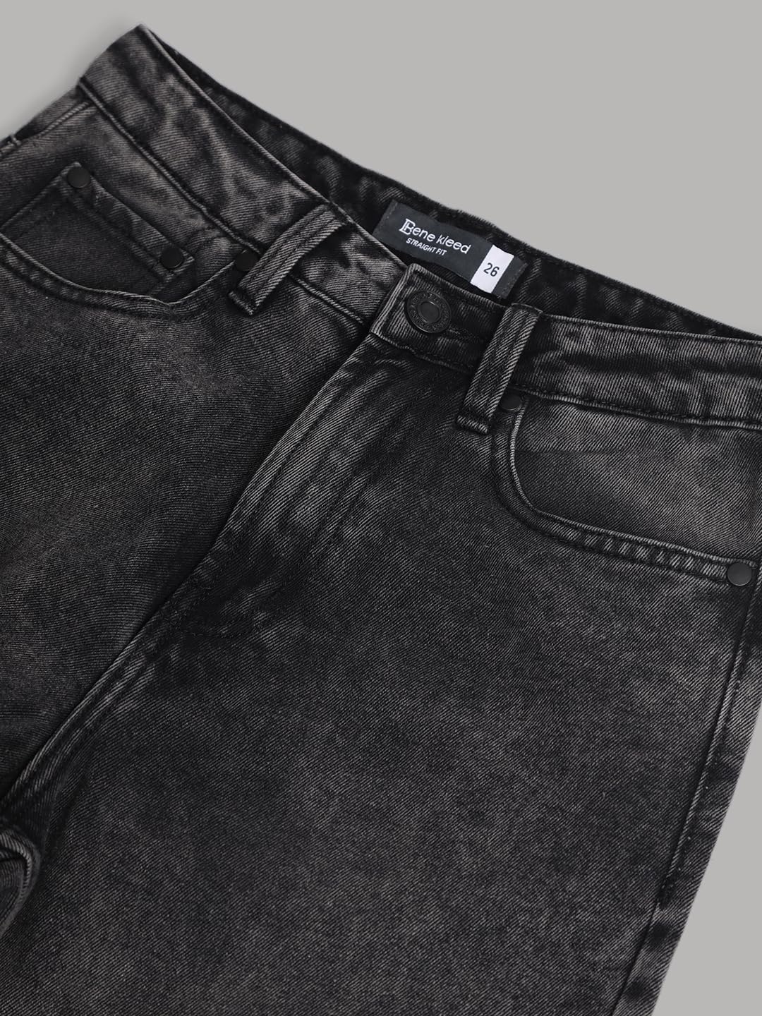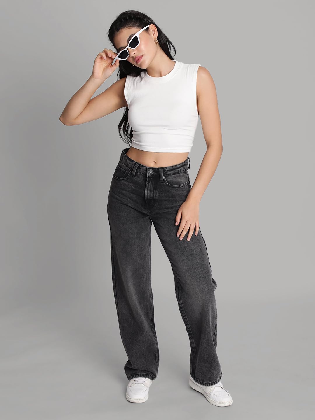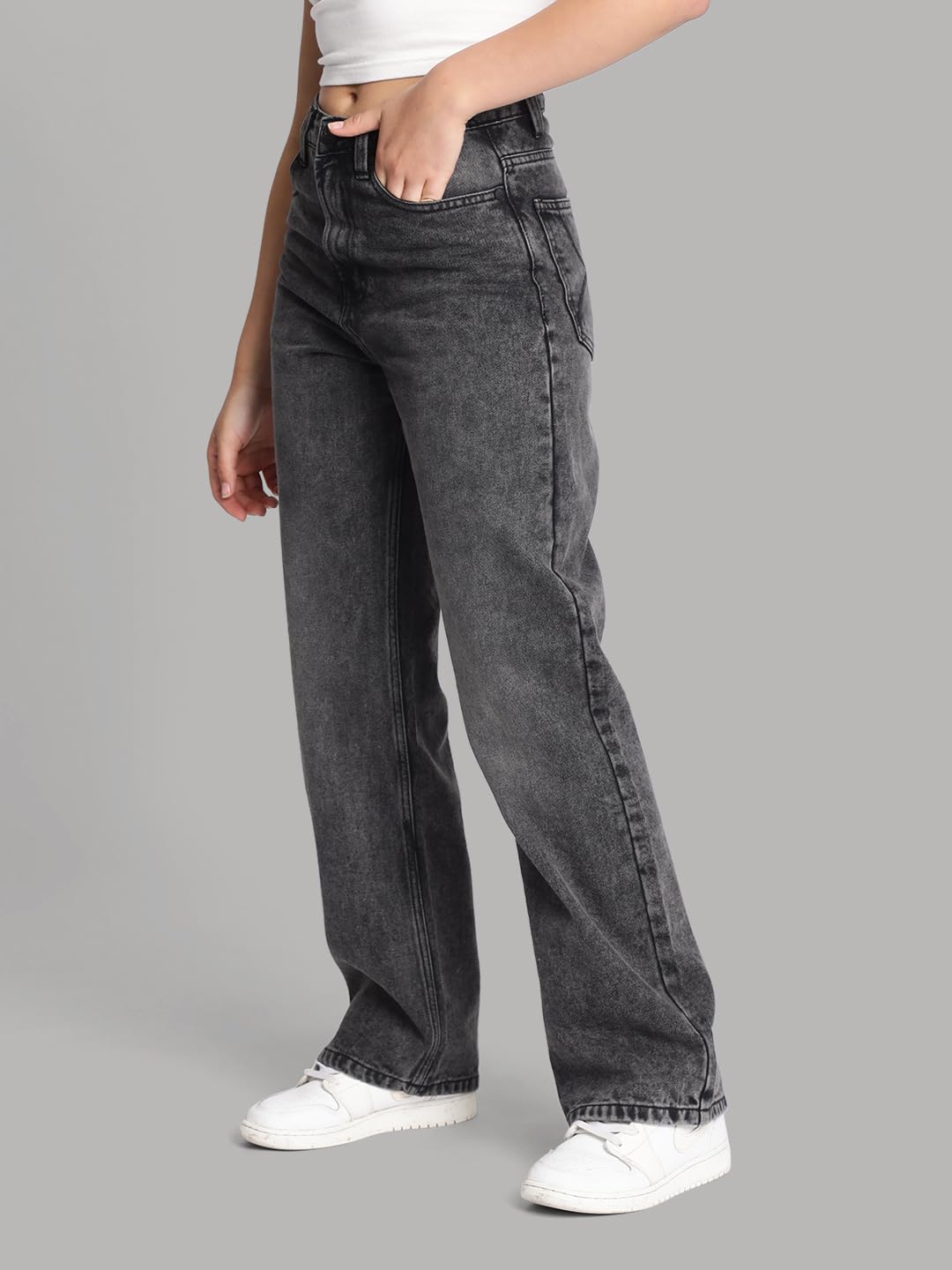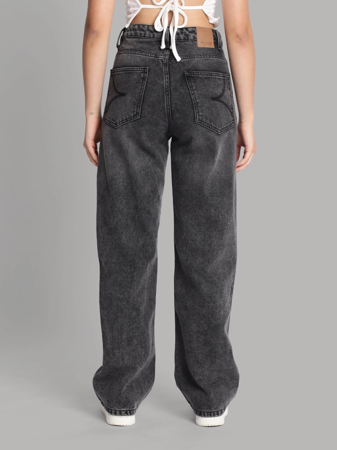 BENE KLEED High-Waisted Wide Leg Jeans, Washed Black Denim, Relaxed Fit