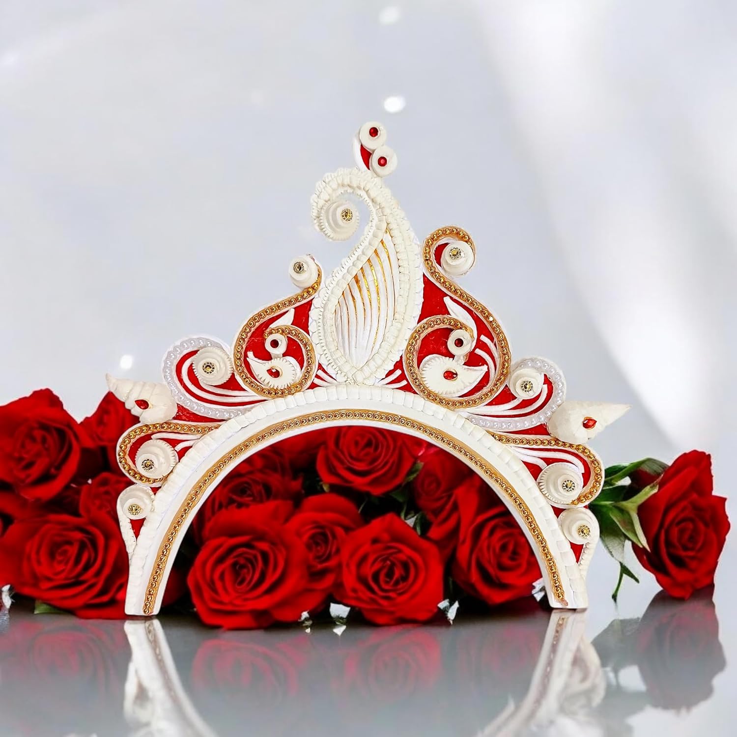 BengCraft Bengali Bridal Sholar Biyer Mukut Crown Hair Accessories for Women, Traditional Trendy Design Wedding White and Red Sola Topor for Marriage Bride