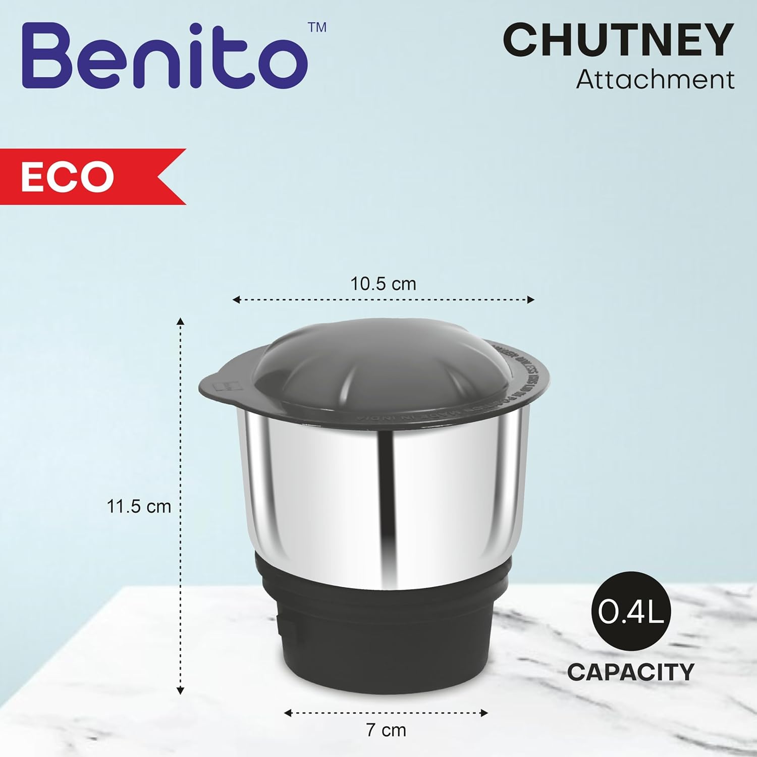 🔹 Durable Build with Precision Design – Made from high-quality stainless steel for long-lasting use, this 400ml chutney jar features a sturdy 4-leaf blade for efficient grinding and an aluminium base for enhanced motor grip and durability.