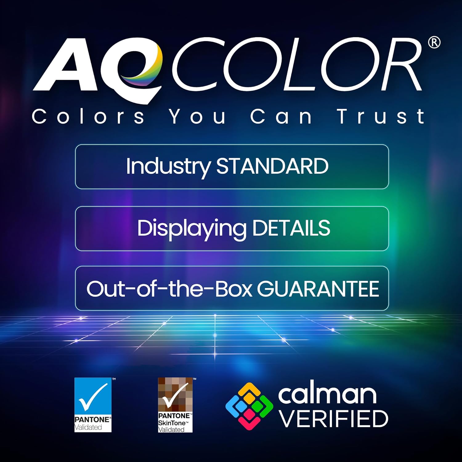 AQCOLOR delivers out-of-box precision with an avg. Delta E≤2, 98% P3 coverage, and corner uniformity