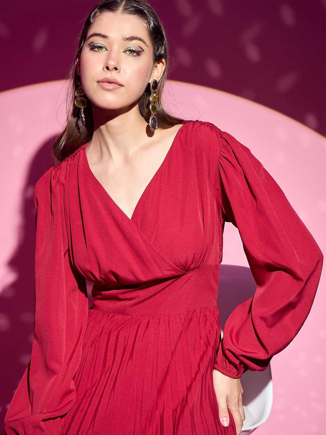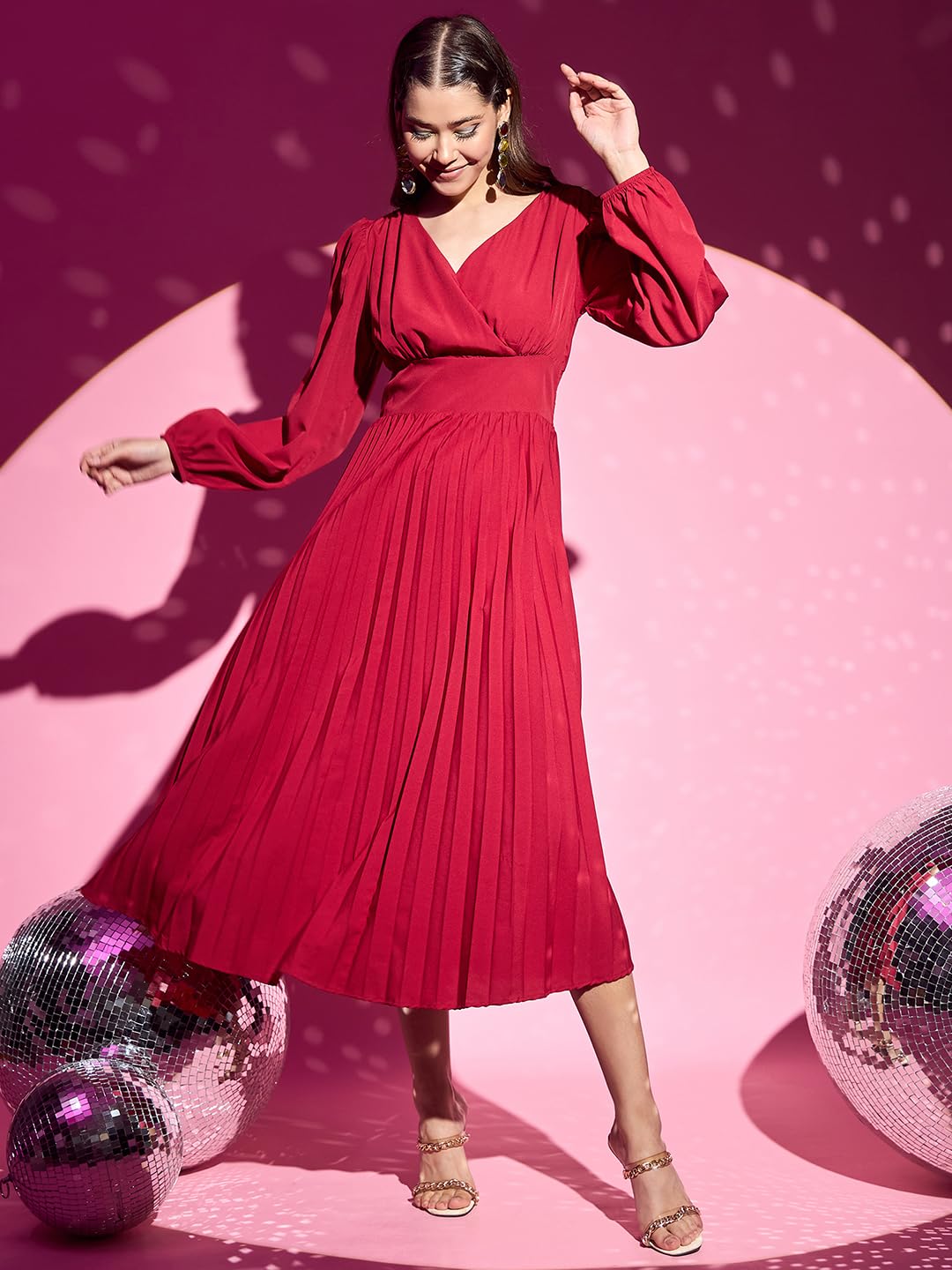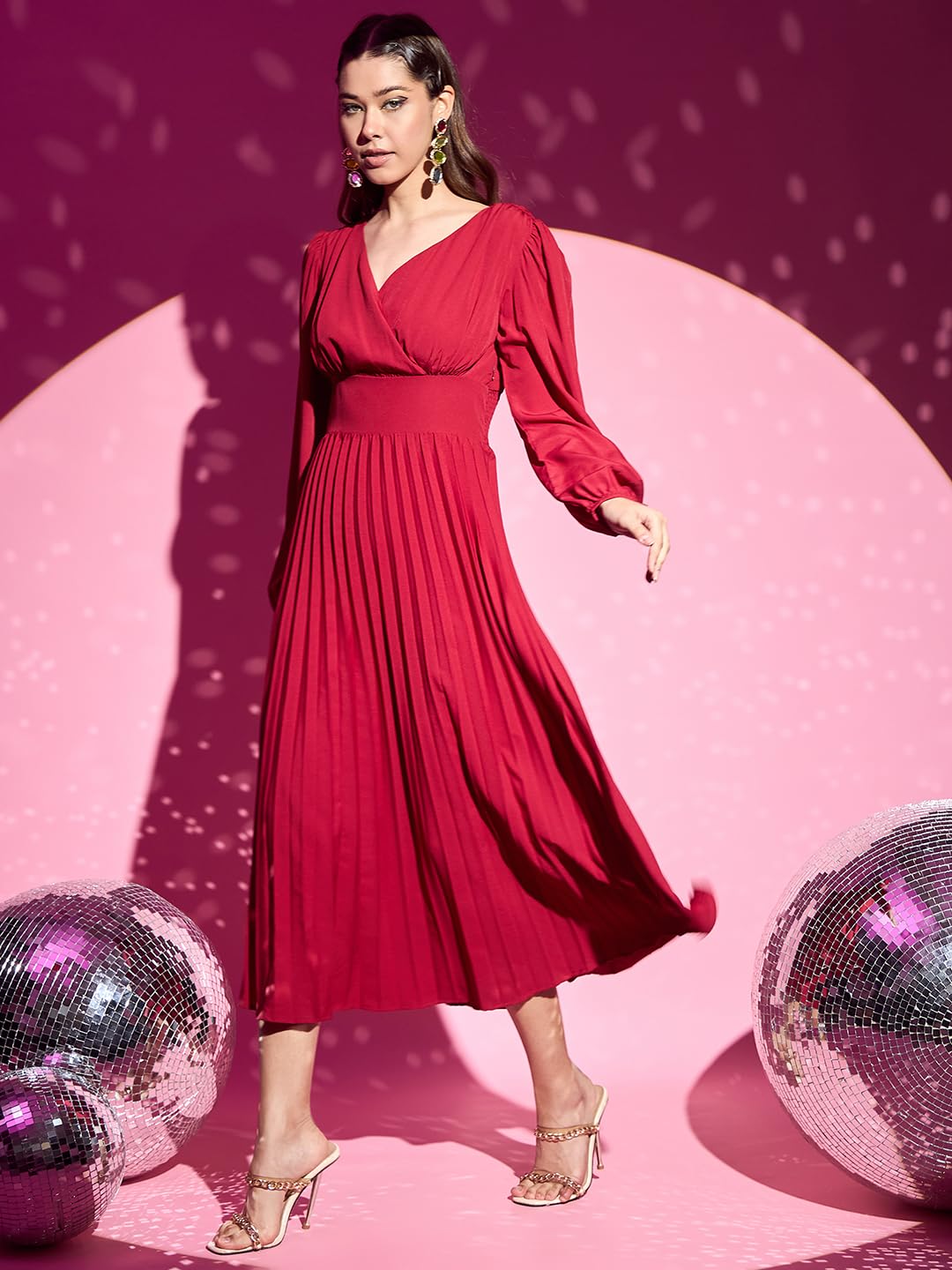 Unleash your inner diva with the Solid Red V-Neck Puff Sleeves Wrap Pleated A-Line Midi Dress from Berrylush. Crafted from luxurious polyester, this stunning midi dress is perfect for any casual outing and effortlessly combines comfort with style. The striking solid red hue makes a bold statement, while the flattering A-line silhouette and pleated detailing add a touch of elegance. Designed to turn heads, the dramatic V-neckline enhances your neckline beautifully and pairs perfectly with puff sleeves that provide an on-trend accent. Featuring a flared hemline for movement and ease, this dress allows you to transition seamlessly from day to night. Whether you’re brunching with friends or enjoying an evening stroll under twinkling lights, this opaque garment ensures confidence at every turn. Step into effortless chicness; embrace unforgettable moments in fashion that celebrate you!