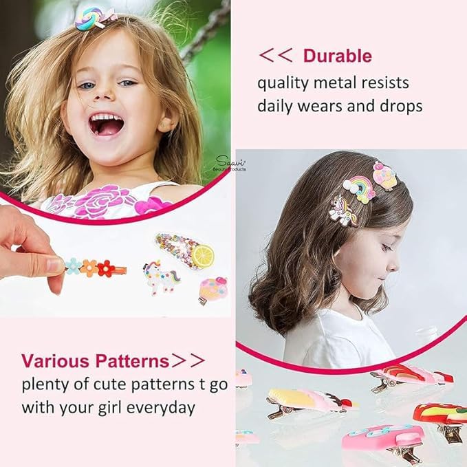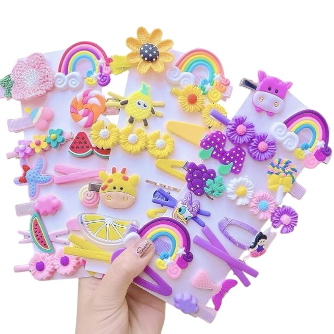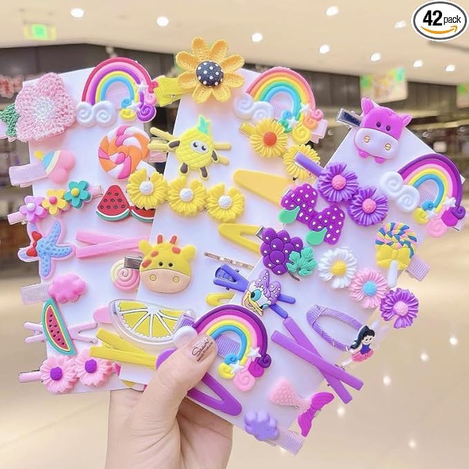 Variety Pack: This set includes 42 multicolour hair clips featuring cute fruit and animal cartoon designs, perfect for kids and girls.