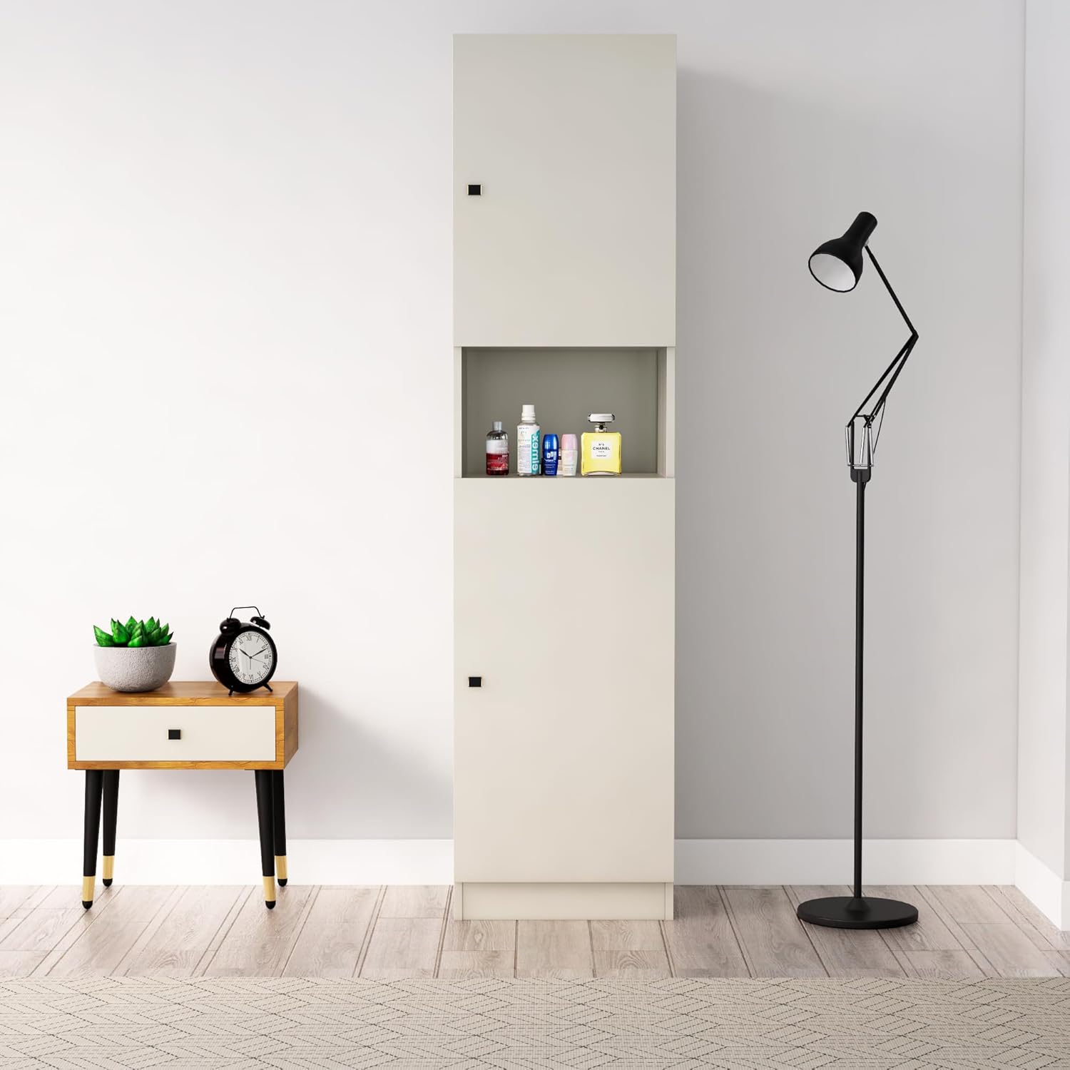 Optimal Storage: Two spacious doors open to reveal a thoughtfully organized interior with hanging space and shelves, allowing you to keep your clothes, accessories, and belongings neatly arranged.
