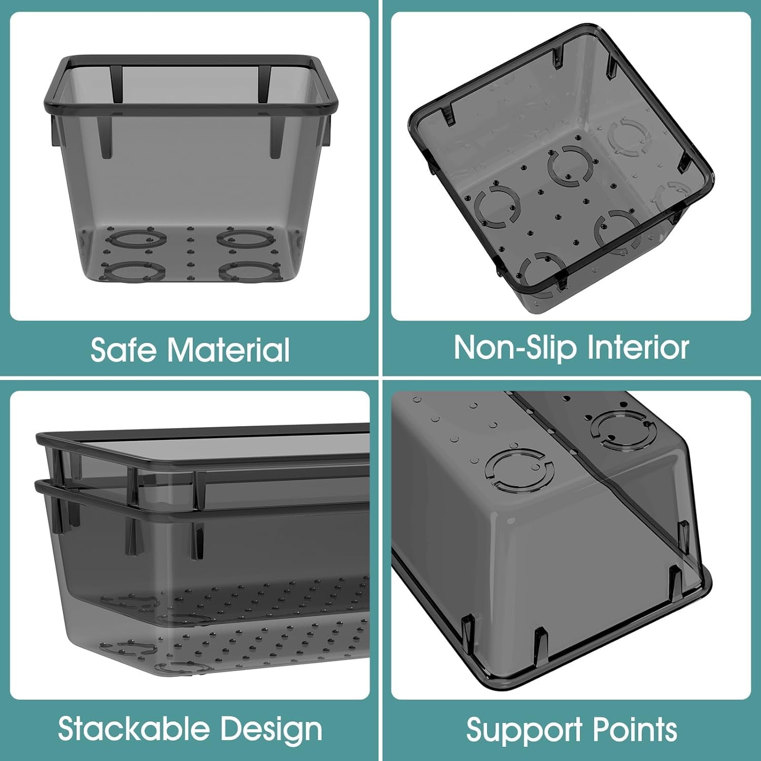 Larger size to hold more items and large supplies, such as kitchen utensils, and household tools.Food-safe material to ensure great organization and storage for food and refrigerator pantry storage.Comes with non-slip silicone pads to keep these drawer bins in place and everything tidy.Stackable design to save up more space and great for deep drawer storage uses.Made from PET plastic, these drawer divider bins are resistant to cracks and scratches.