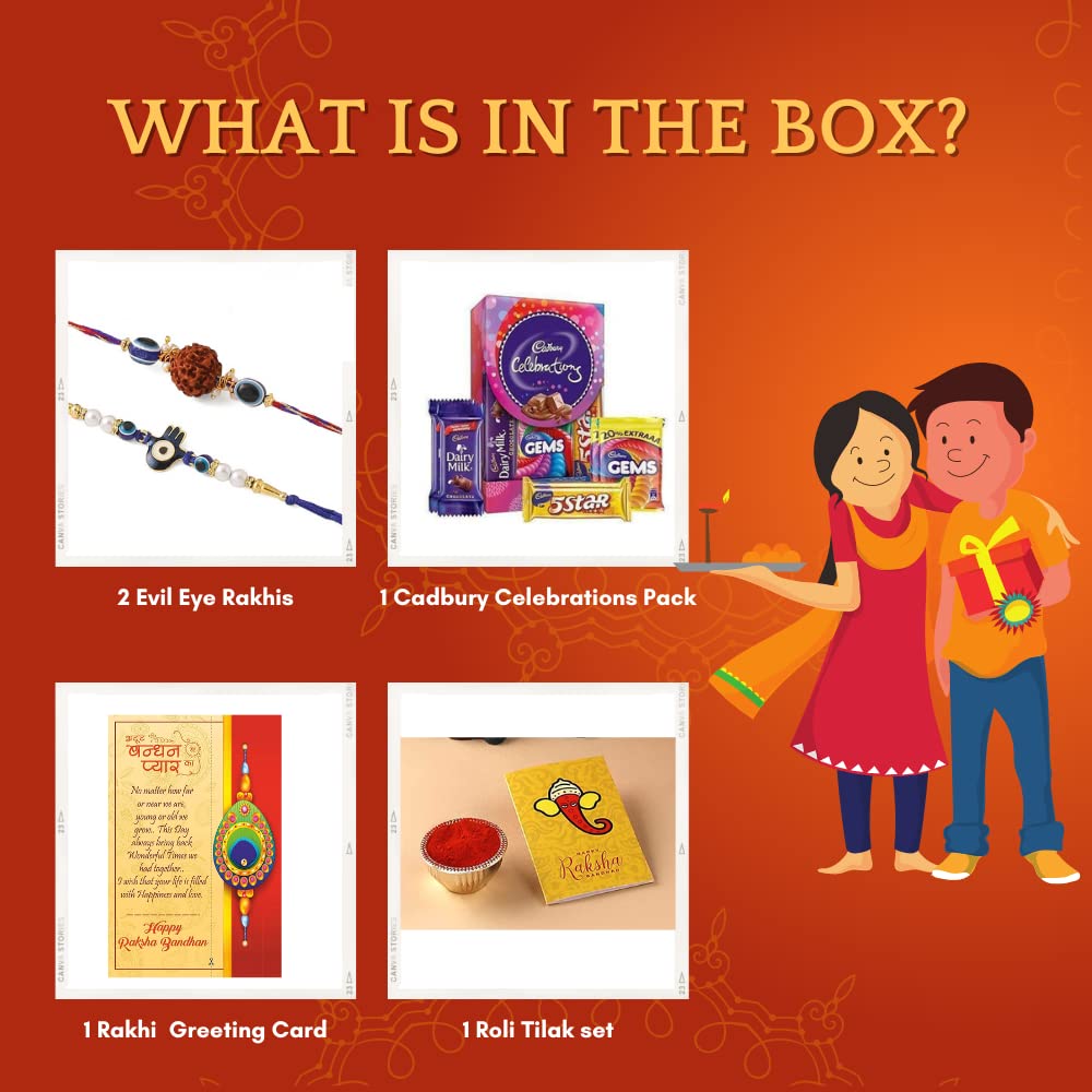 Rakhi Combo Package Content (5 Items): 2 Premium Rakhis ( 1 Evil Eye Blue Beaded Hamsa Hand Rakhi for Bhaiya, 1 Evil Eye Blue Beaded with Rudraksh for Brother ), 1 Cadbury Celebration Small Pack, 1 Best Wishes Greeting Card, 1 Roli Tilak Set