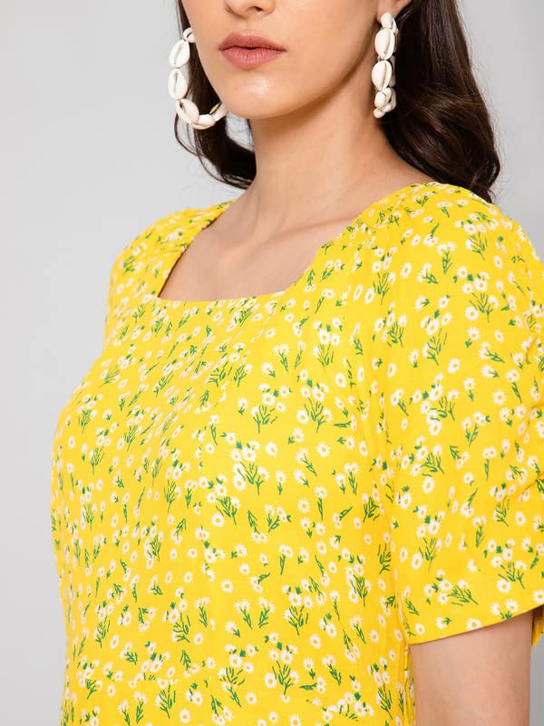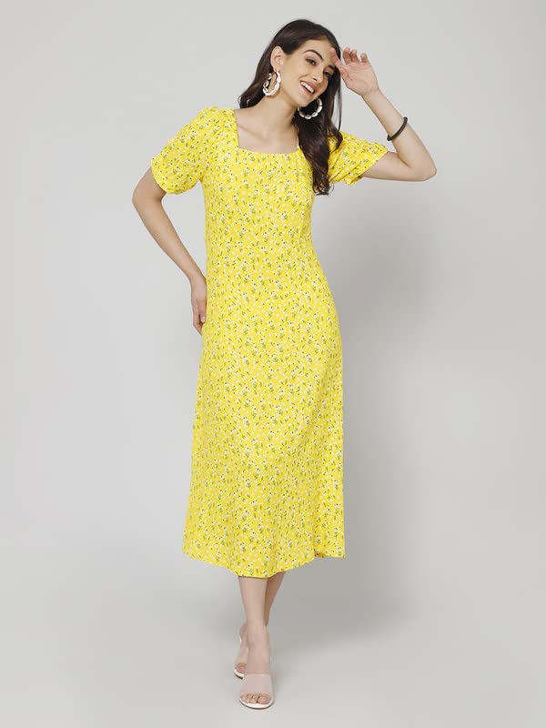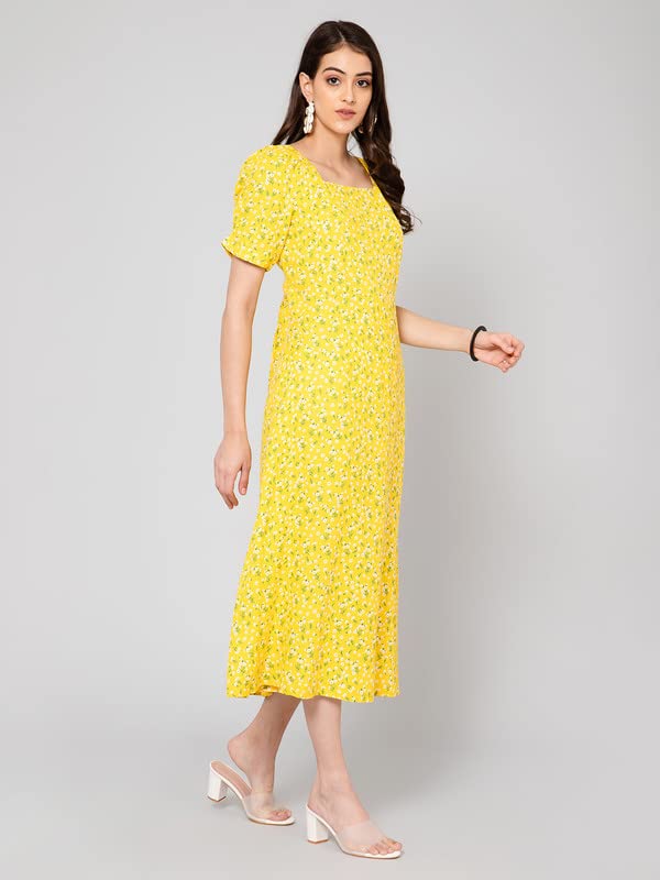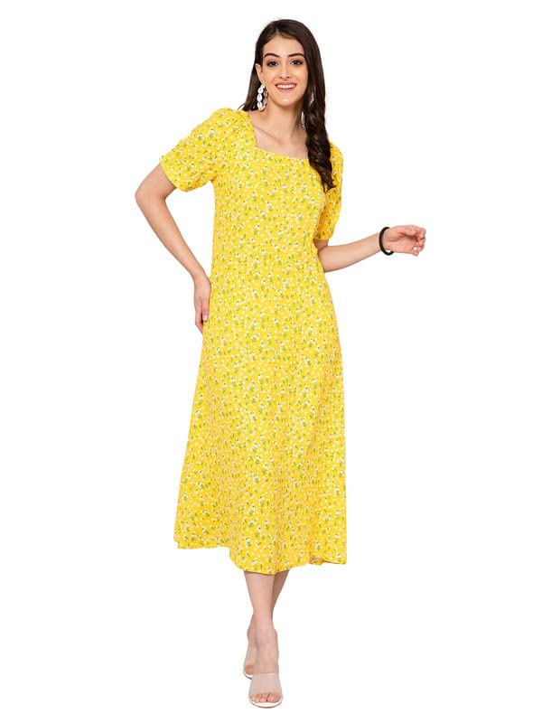 Cantabil Women Printed Square Neck Half Sleeve Fit and Flare Casual Dress I Casual Dress for Women l Printed Women Dress (P_LDRS00037_Yellow)