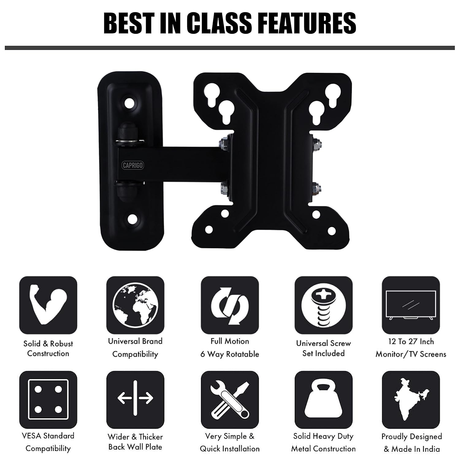 New & Advanced Design Premium Solid Heavy Gauge Metal ConstructionThicker & Stronger Metal Arms And Back Wall Mounting Plate For Additional Support And Strength.Longer & Stronger Wall Screws For Additional Safety And Peace Of Mind And A Hassle Free Mounting Experience.Most Recommended Wall Mount For All Universal : 12 To 27 Inch TV & Monitor Screens.Class Leading Safety Loading Weight Capacity : 10 KG’s