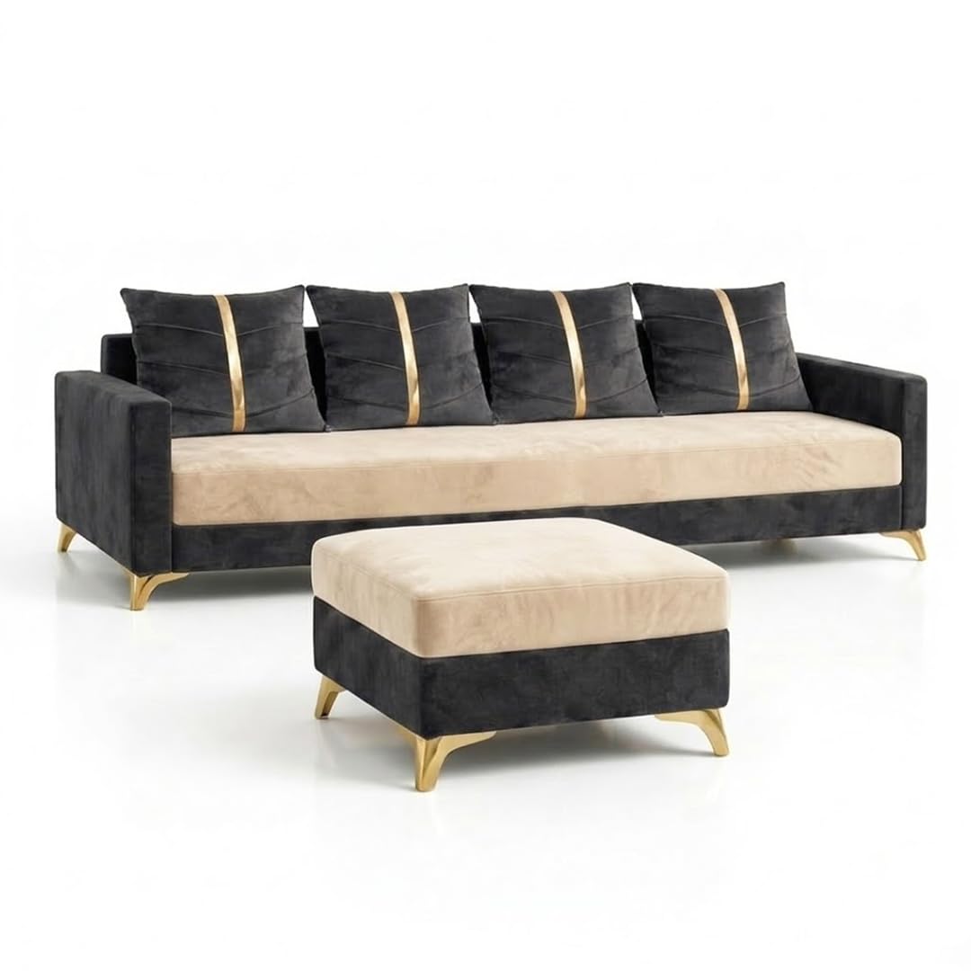Caviar Plush Comfort Sofa Set | 4 Seater with Ottoman | Luxury Velvet Suede Fabric | Modern Living Room Sofa | Dark Gray – Cream