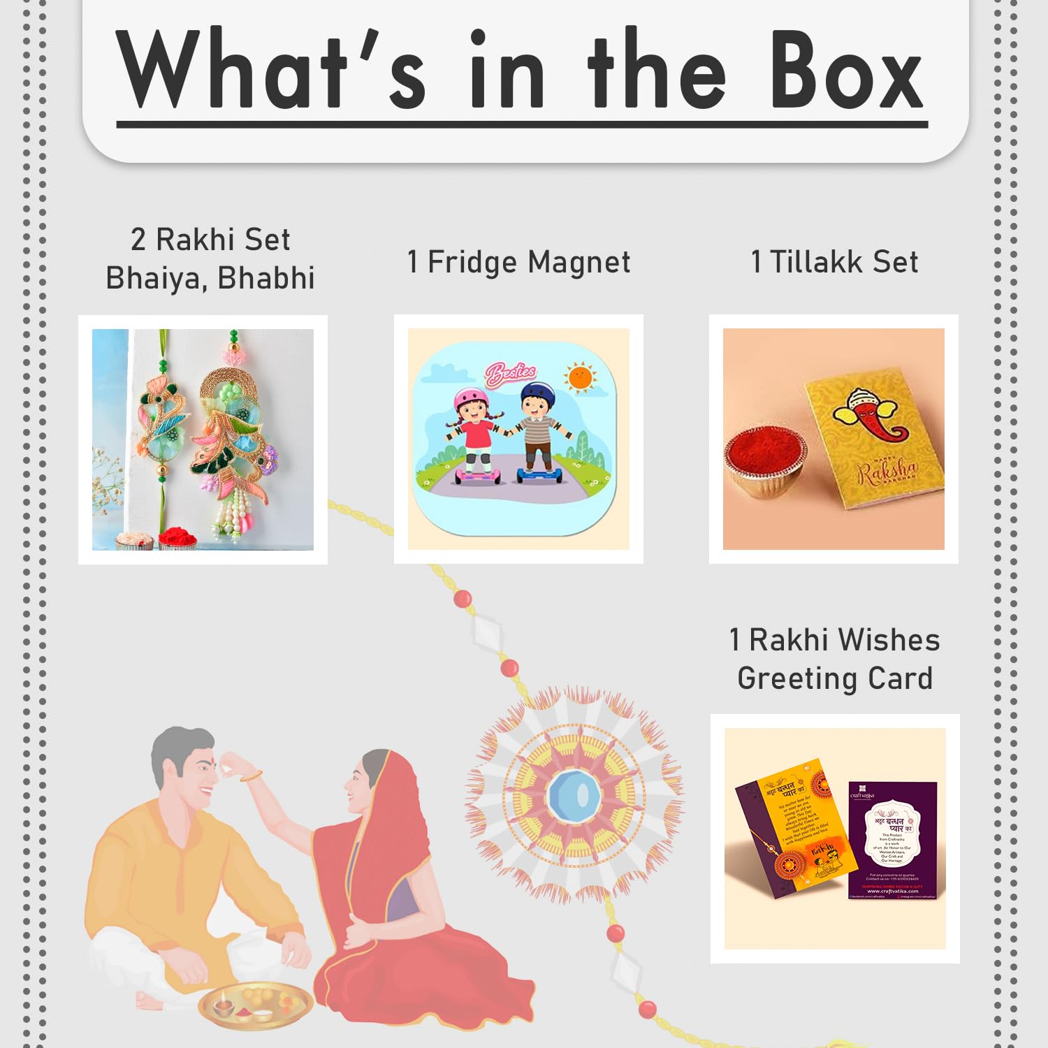 Rakhi Combo Package Content (5 Items): 2 Premium Rakhis (1 Floral Rakhi for Brother, 1 Premium Floral Booty Rakhi for Bhabhi ), 1 Fridge Magnet for Fridge Decor,1 Best Wishes Greeting Card, 1 Tilakk Set