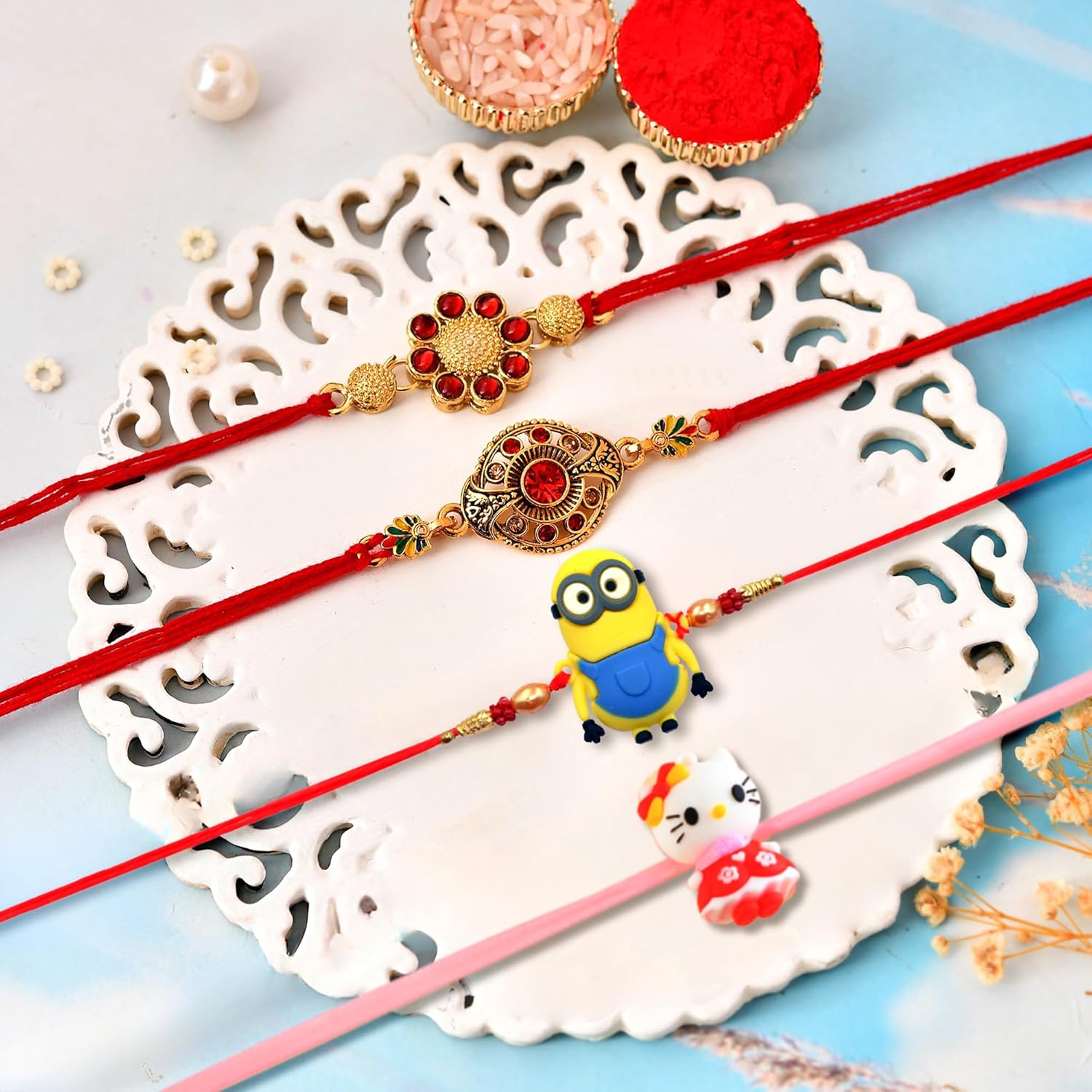 CraftVatika Rakhi Set of 4 for Brother and Kids, Designer Cartoon rakhi for Children Baby Kids, Kundan Rakhi for Rakshabandhan Set with Greeting Card, Raksha Sutra Thread Set with Fridge Magnet Gift