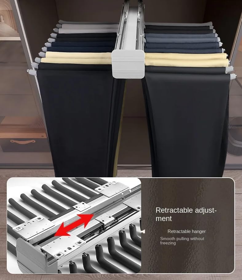 Durable Trouser Hanger: Made of aluminum alloy material and ABS plastic, it still works stably after tens of thousands of push and pull tests,Durable and long service life. Stable and firm, max load 75 lbs.