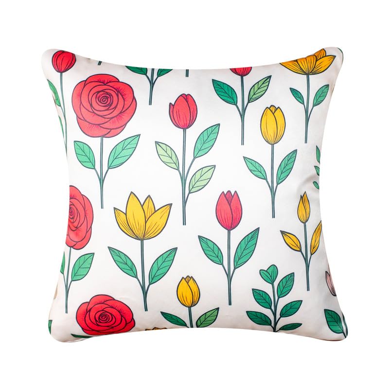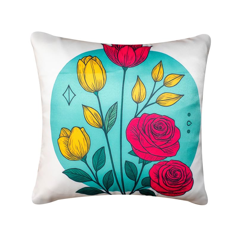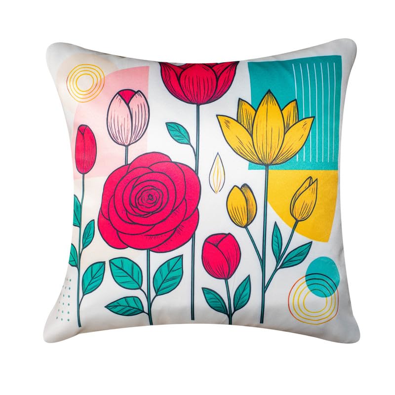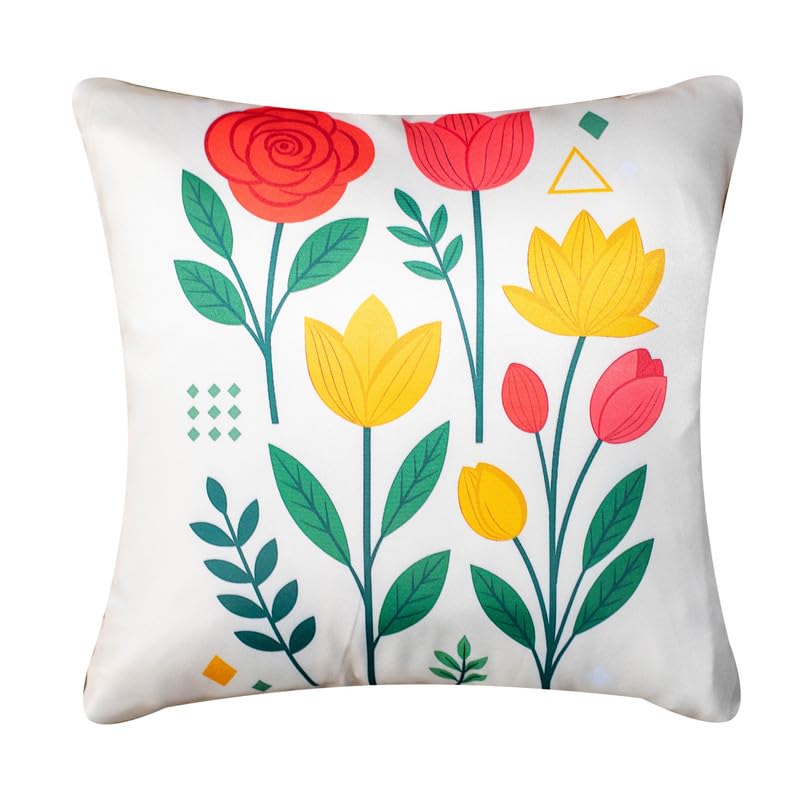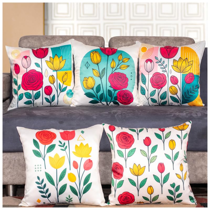 Decorative Satin Sofa Cushion Covers Set of 5, 20 Inch x 20 inch, Sofa Pillow Cover, Red and Yellow, Floral Design, Zipper Closure (Colour Craze, 20X20 Inches)