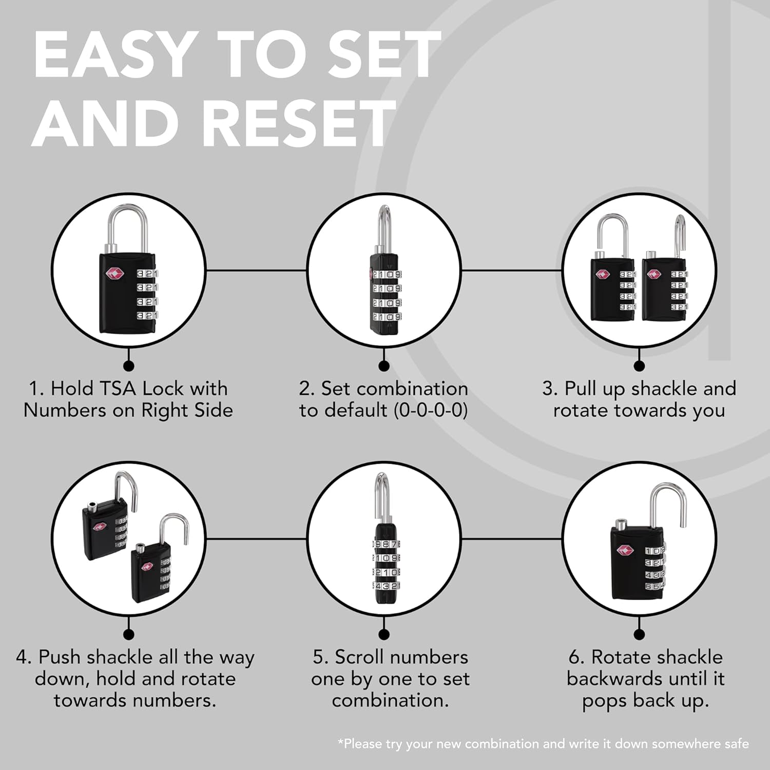 Protect your luggage with top quality 4-digit combination TSA-approved padlocks.Numbers are easy to maneuver, reset and set to your own preferred passcode.