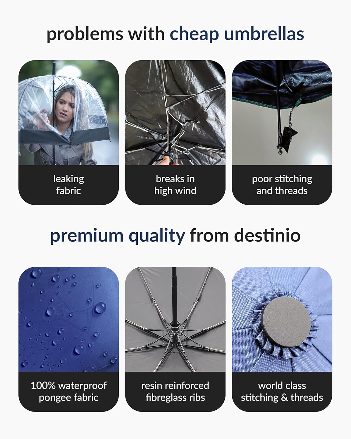 Destinio foldable umbrellas for men, women are designed with you in mind and built to ensure the ultimate protection and comfort in any weather condition. Measuring just 13.4 inches long when folded and lightweight for easy storage in purses, briefcases, backpacks, and more. Destinio Travel Umbrella is fortified with 10 resin-reinforced fiberglass ribs that flex slightly to withstand powerful gusts without turning inside out and defend against the elements like no other umbrella. A useful addition to any travel bag, backpack, or briefcase, this Destinio compact automatic travel umbrella helps keep you dry when the skies turn dark and the pouring rain begins. From warm Spring showers to fierce Fall storms and unruly wind tunnels, the Destinio umbrella makes for a great take-along companion when you need to get from here to there without getting drenched. Built to last through many rainy seasons, year after year, the Destinio compact automatic travel umbrella features durable steel construction with a canopy made of reliable, waterproof pongee fabric. Sturdy, yet lightweight, the umbrella helps get you where you’re going without having to worry about the weather. Thoughtfully designed, the umbrella’s canopy automatically opens and closes with the simple touch of a button. Push the button to open; push the button to close. After the canopy collapses, manually pull the upright support down into the locked position. With the umbrella back in its base, the auto-open mechanism is ready to be used again. The Destinio compact automatic travel umbrella includes a slip-on sleeve, which helps keep the umbrella neatly stored. The storage sleeve fits securely around the closed-position umbrella and lifts off easily when it’s time to take cover and venture outside. The umbrella comes equipped with a soft, secure-grip handle, which helps ensure a comfortable hold, whether casually window-shopping downtown or dashing from your car to the front door.