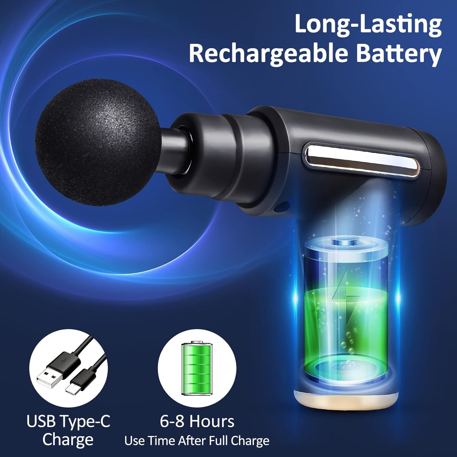 Fast Charging, Long Working Time This mini electric massager adopts high-quality lithium battery, Type-C charging port, which can share the charging line with the mobile phone. In general, it only takes 2-3 hours to fully charge, and it can be used continuously for 4-6 hours.