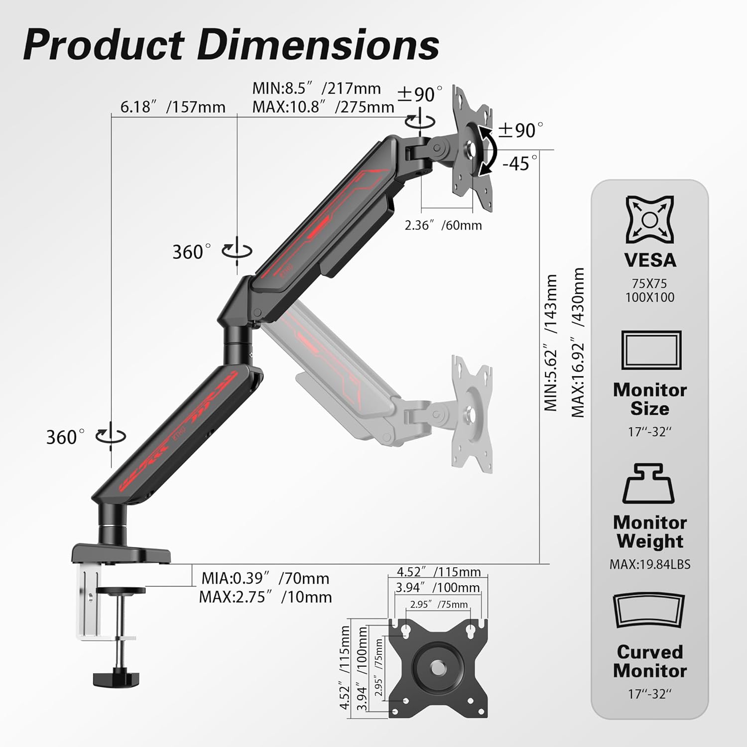 1. Universal Compatibility: ETHU single monitor arm desk mount C clamp is suitable for 12-32 inch screens with a weight capacity of 4.4lbs-19.8lbs, making it perfect for most 17-30 inch monitors available in the market. 2. Full Motion Adjustability: Enjoy a comfortable viewing angle while working or gaming with our product’s full-motion adjustability options. The monitor can be rotated, tilted, and swiveled Tilt Angel from -45 degrees to +95 degrees with a combined 360 degree VESA Part Rotations, Upright range is 10”(260 mm) with swivel angel ±90 degrees ,Easy positioning of your monitor in any desirable position 3. Heavy-Duty Construction: ETHU monitor arm desk mount C clamp is built with automotive-grade gas spring cores and high-quality materials, making it sturdier than other products on the market. 4. Ergonomic Design: Improve your overall well-being with our product’s ergonomic design. Easily adjust the height and angle of the monitor to create the most comfortable viewing experience for your spine, neck, and shoulders. 5. Easy Installation: Our product comes with detailed instructions and all necessary hardware, making it easy to install within 10 minutes by one person. The hidden cable management feature keeps your desktop neat and organized for a clutter-free workspace.