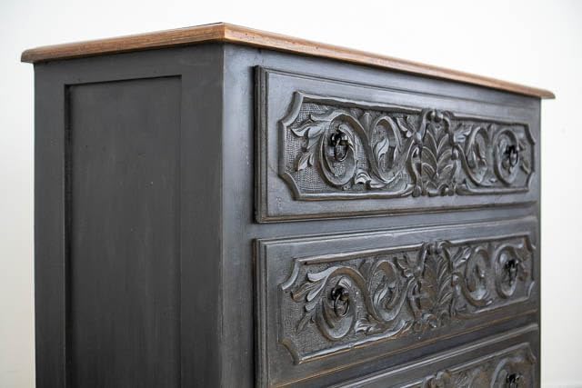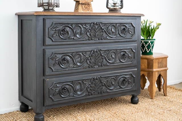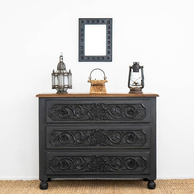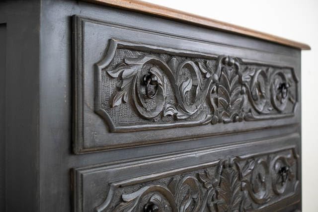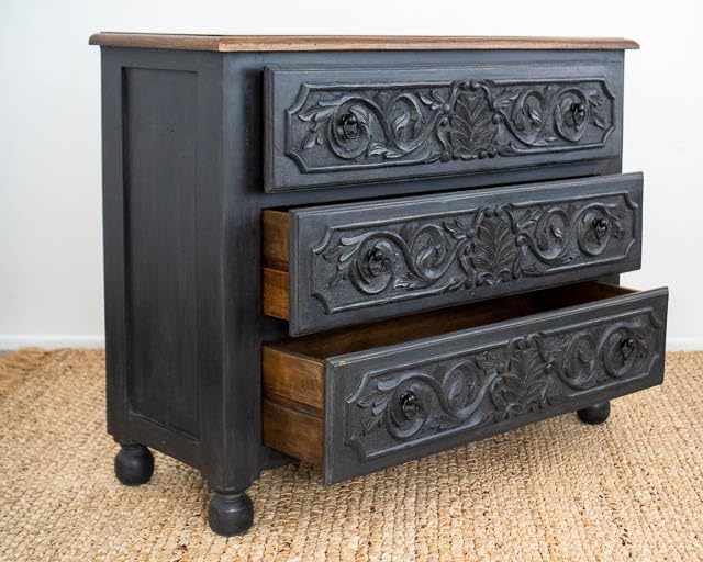 Furniture 3 Drawer Mango Wood Dresser, Floral Carved Chest Storage Cabinet in Charcoal Grey
