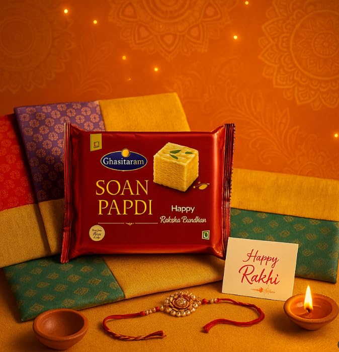 Ghasitaram’s Rakhi Set For brother’s Soan Papdi Gift Hamper, Traditional Indian Sweets, 400gm with Rakhi, Roli Chawal, Card