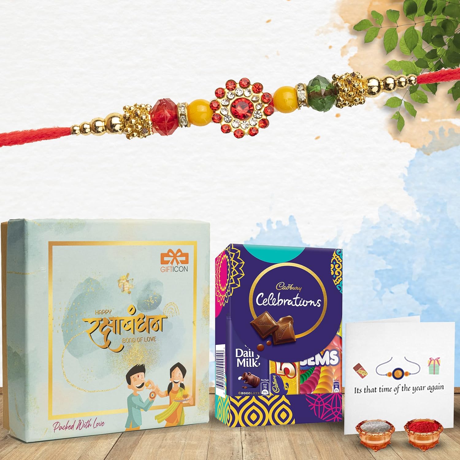 Rakhi for Brother Combo: Gifticon Presents Premium Range Of Raksha Bandhan Gifts For Brothers. This Package Contains 1 Unit Of Exquisitely Crafted Rakhi With Roli Chawal, 1 Greeting Card and 1 Cadbury Celebration (50/-)