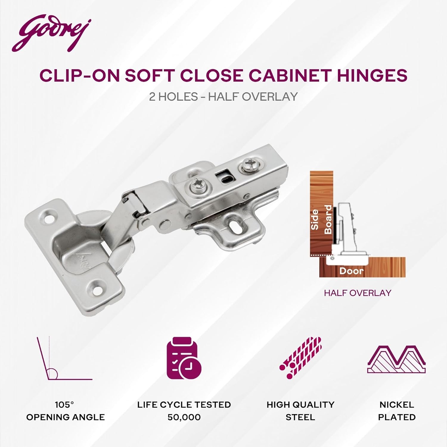 Godrej Cabinet Hinges| Clip On Soft Close | Half Overlay 2 Holes Doors | 15-22 mm Panel Thickness |1 Year Warranty | Wardrobe, Kitchen, Bathroom | Pack of 4