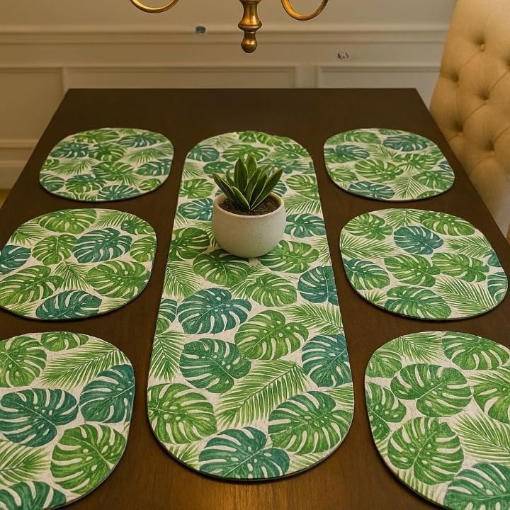 Handmade Cotton Rope Dining Table Runner & Placemat Set – Ethnic Embroidered Design – 1 Table Runner + 6 Placemats – Durable, Washable Dining Décor Combo (Green)
