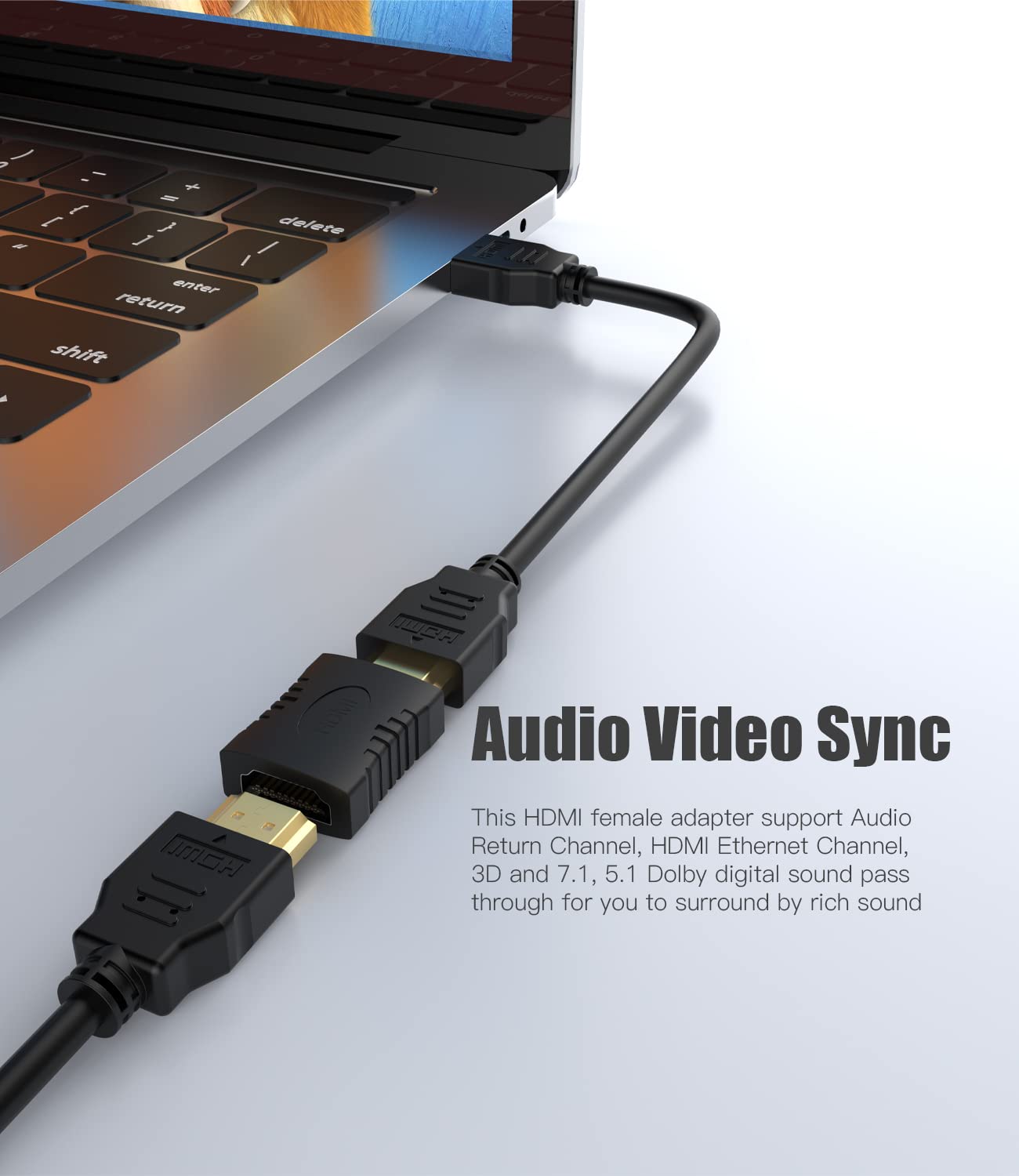 [Ultra Durability] : Constructed with fully shielded aluminum alloy housings and reinforced connector, the HDMI Female to Female Adapter can effectively avoid EMI interference and withstand 9999+ plugging and unplugging.