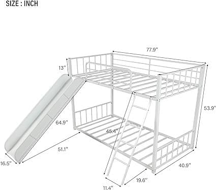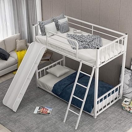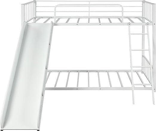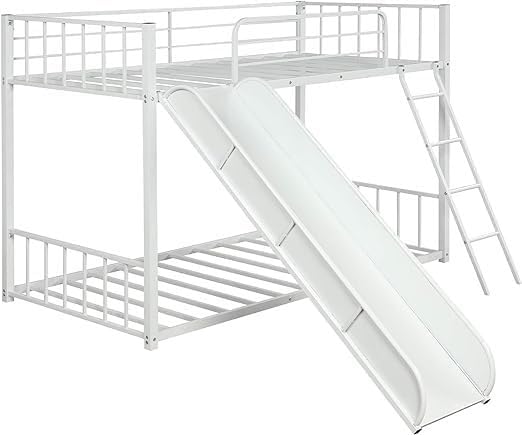 HeritageArt Twin Metal Bunk Bed with Slide, No Box Spring Required (White Low Bunk Beds with Slide)