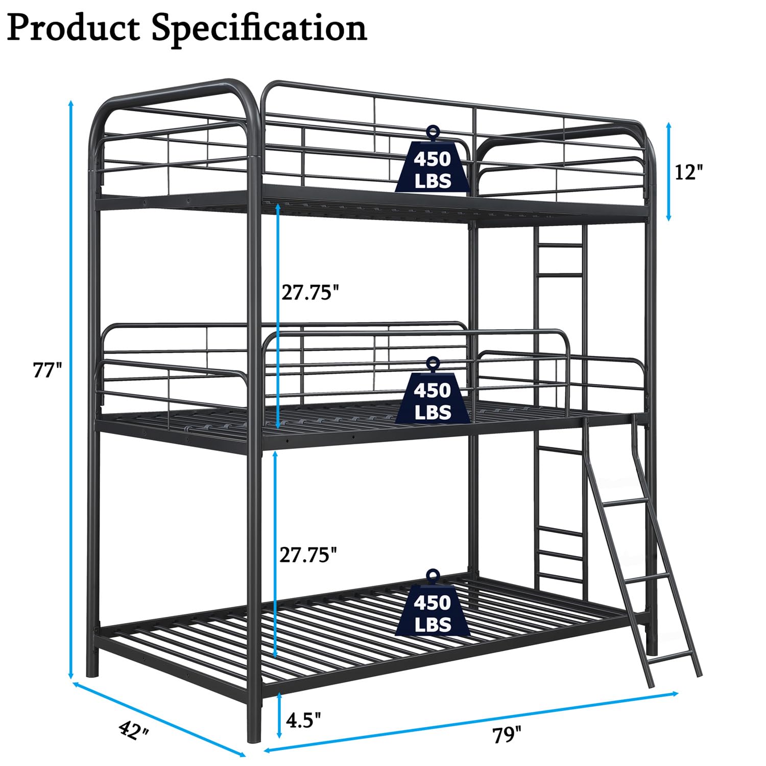 [Sturdy Metal Triple Bunk Bed] — This is the latest version of our metal triple bunk bed, unlike other metal triple bunk beds, the metal triple bunk bed made by our designers features a stronger steel frame and thicker steel legs. It is also paired with high quality 22+22+22 metal slats to provide a strong load-bearing capacity. This structure offers better construction and longevity. (Load capacity: top bunk bed. 450 lbs/middle bed. 450 lbs/bunk bed. 450 lbs)