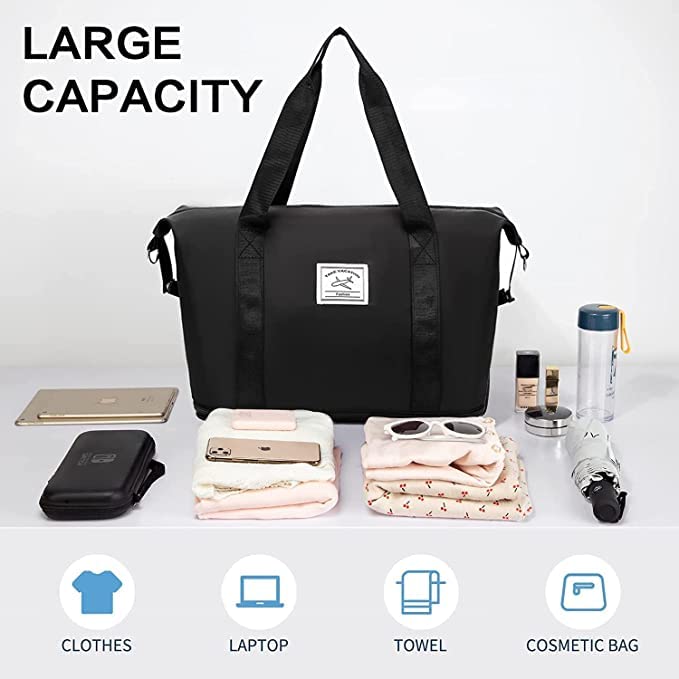 folding travel bag made with lightweight waterproof and nylon fabric, durable and strong enough to carry. It is enough for short trips and can easily accommodate 3-5 days of travel clothes.