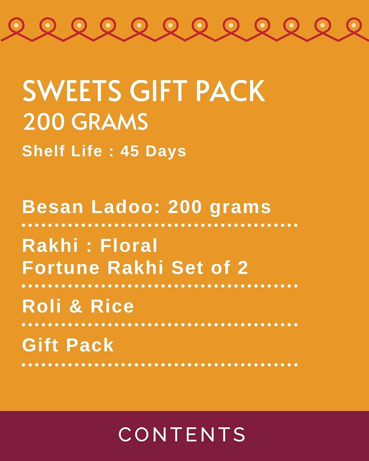 Rakhi Sweets Gift Pack Contains: 200gm Besan Ladoo & Floral Fortune Rakhi Set of 2 with Roli & Chawal.