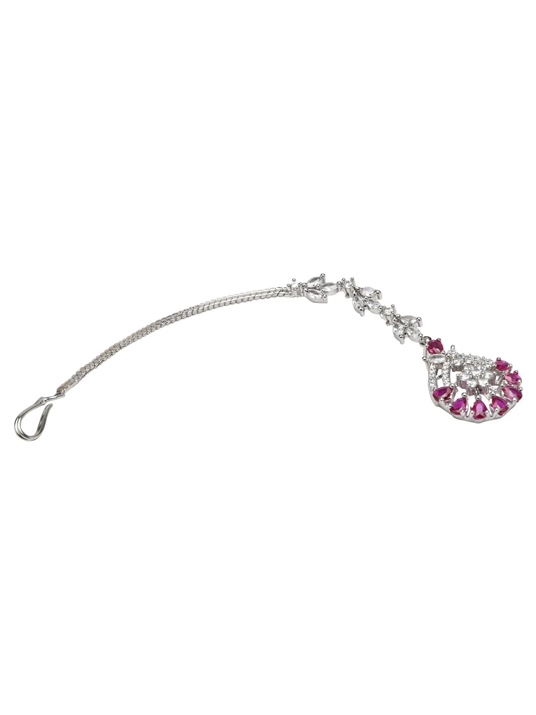 Dimensions: Maang Tikka: Height – 11.5cm x Width – 1.5cm. This maang tikka is crafted in Silver-plating and features AD Stone studded in it and secured with a hook closure. Style this as maang tikka with your ethnic attires to complete the look. Perfect Accesory for your jewelry box!