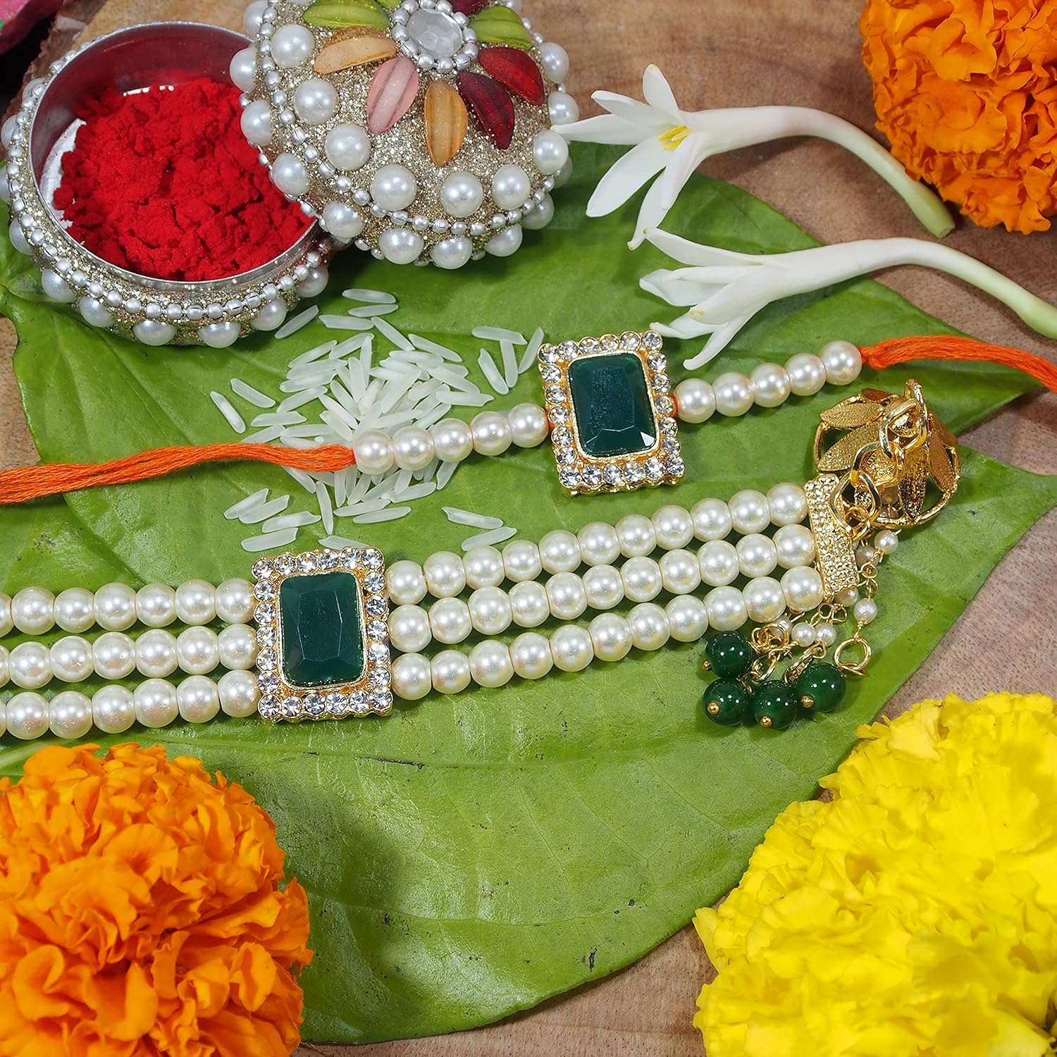 I Jewels Kundan & Pearl Bhaiya Bhabhi Lumba Rakhi Bracelet Combo Set With Roli Chawal & Rakshabandhan Card (R010-CO)