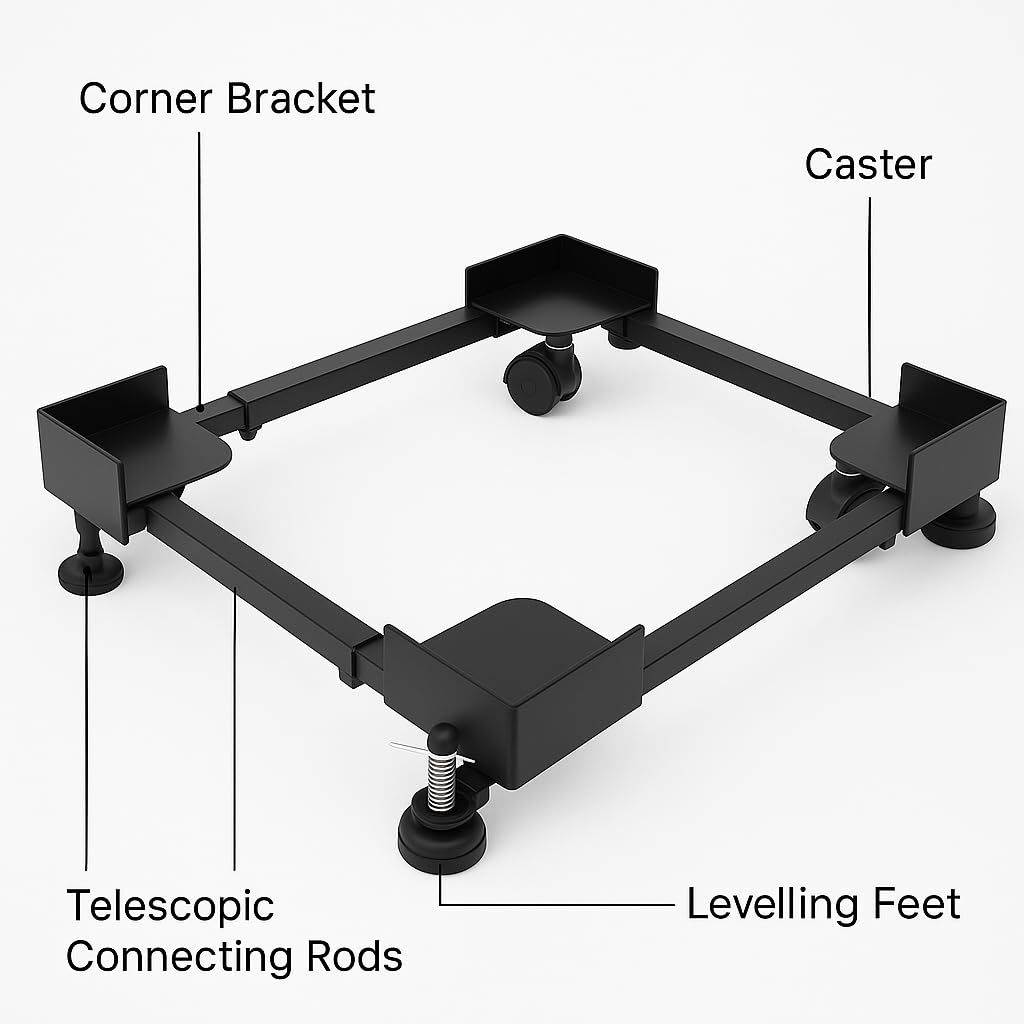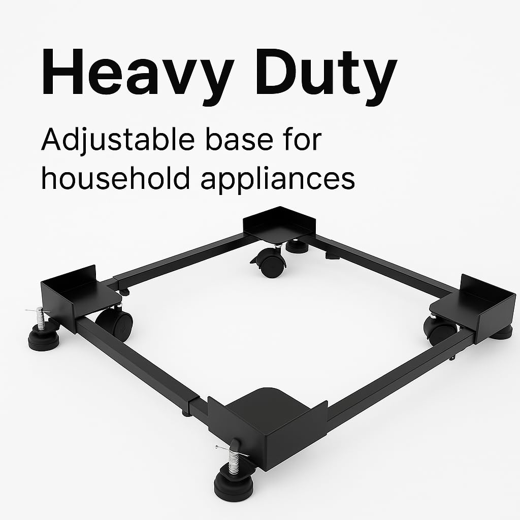 Enhance the stability and mobility of your home appliances with the Adjustable Front and Top Load Washing Machine Stand. Made entirely of high-quality metal with a sleek silver and black finish, this stand offers exceptional durability and a robust design capable of supporting heavy appliances up to 190 kg. Featuring a convenient size adjustment mechanism, the stand adapts to various washing machines and refrigerators, accommodating dimensions from 17″ X 20″ Inch to 31″ X 26″ Inch. Its 360° rotating wheels provide effortless movement, allowing you to reposition your appliances for cleaning or convenience, while the integrated jack ensures stability when stationary. This stand is designed to absorb vibrations, reduce noise, and keep your washing machine or refrigerator steady during operation. Compatible with top load and front load washing machines from all major brands, it’s the perfect solution for maintaining appliance efficiency and prolonging their lifespan. Upgrade your home appliance experience today with this versatile, durable, and functional stand!