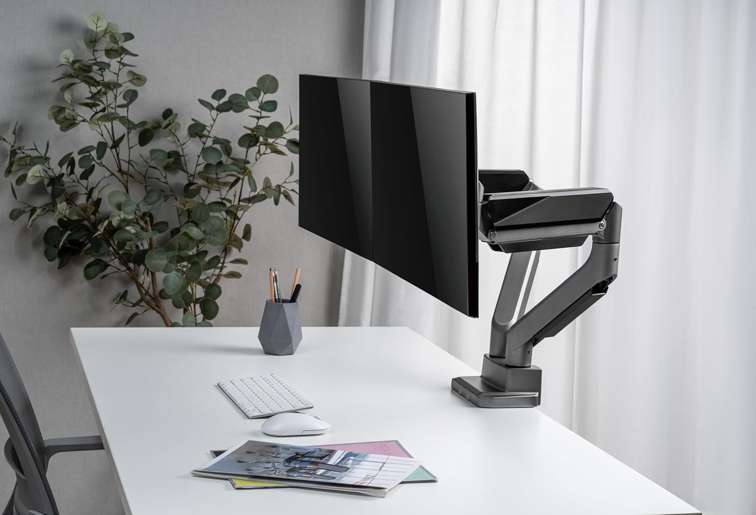 Technical Specs Color: Space Gray; Material: Steel and Aluminum Screen Sizes: upto 35″ inches per arm VESA Compatible: 75×75, 100×100 mm Monitor Weight Capacity: 15 kgs per arm Gas Spring Mechanism: allows your monitor to stay at any position Supports C-clamp and Drill Installation