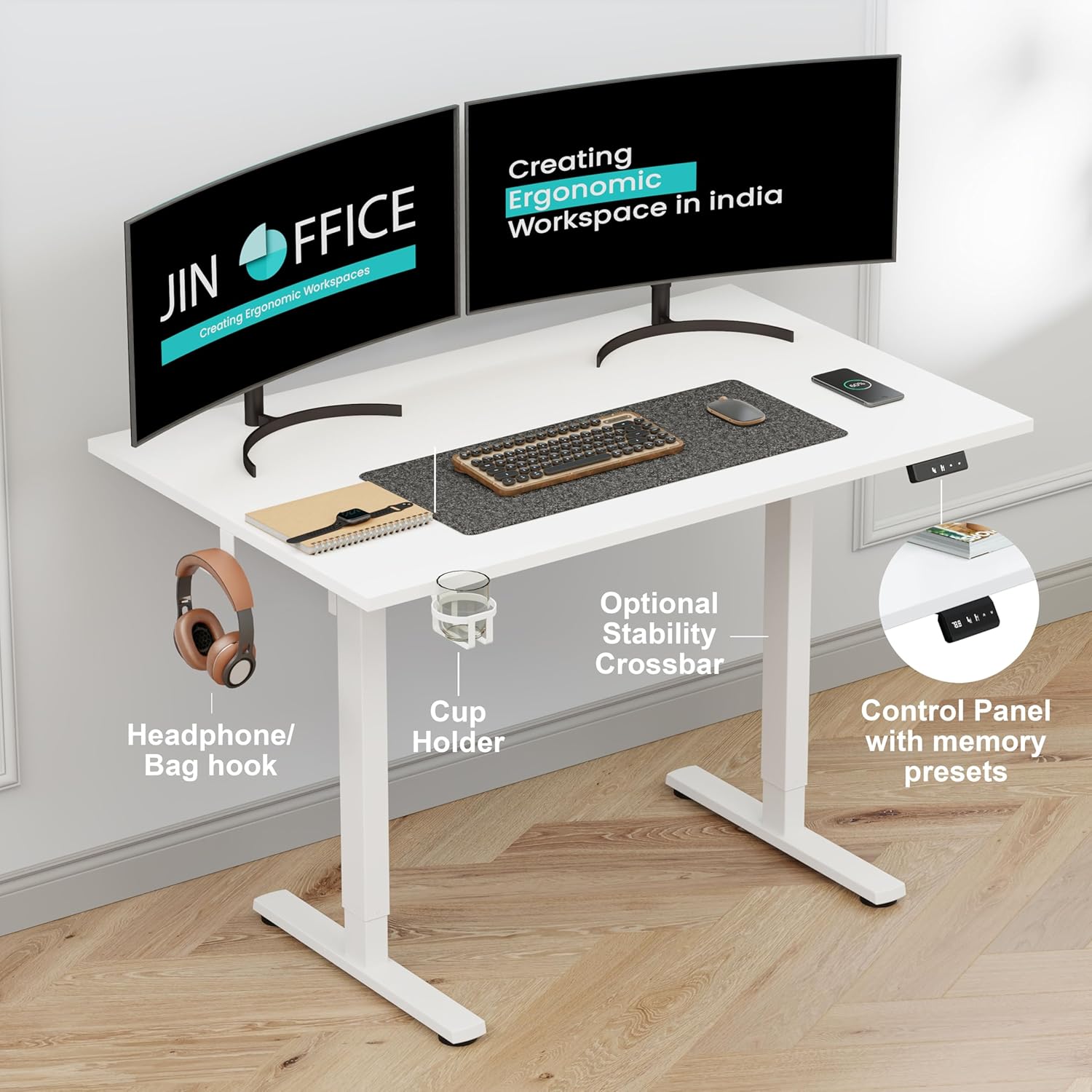 Jin Office Octave Neo Electric Height Adjustable Table| Standing Desk with 80 Kg Wt. Cap, 2 Year Warranty| Sit Stand Ergonomic Table with Memory Preset,Cup Holder| Stability Crossbar|White 1100*600mm