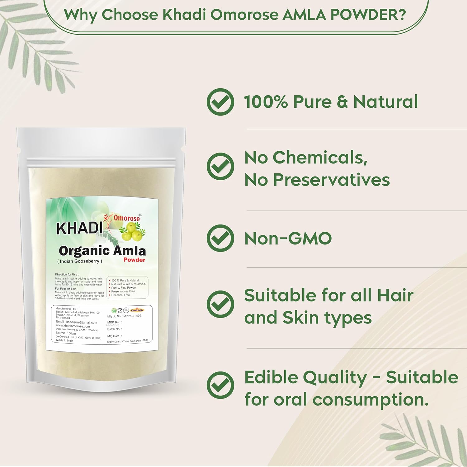 Khadi omorose Amla powder is natural and does not contain any additives or chemicals and is safe to use, Sourced from farms.