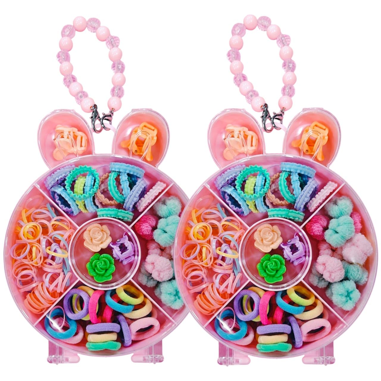 “Kids Hair Accessories Gift Box | Bear Shape Organizer with 50+ Rubber Bands, Pom-Poms, Soft Fabric Bands & Mini Claw Clips (Rose & Bow Shape) | Perfect Return Gift, Birthday Gift, Rakhi Gift for Girls