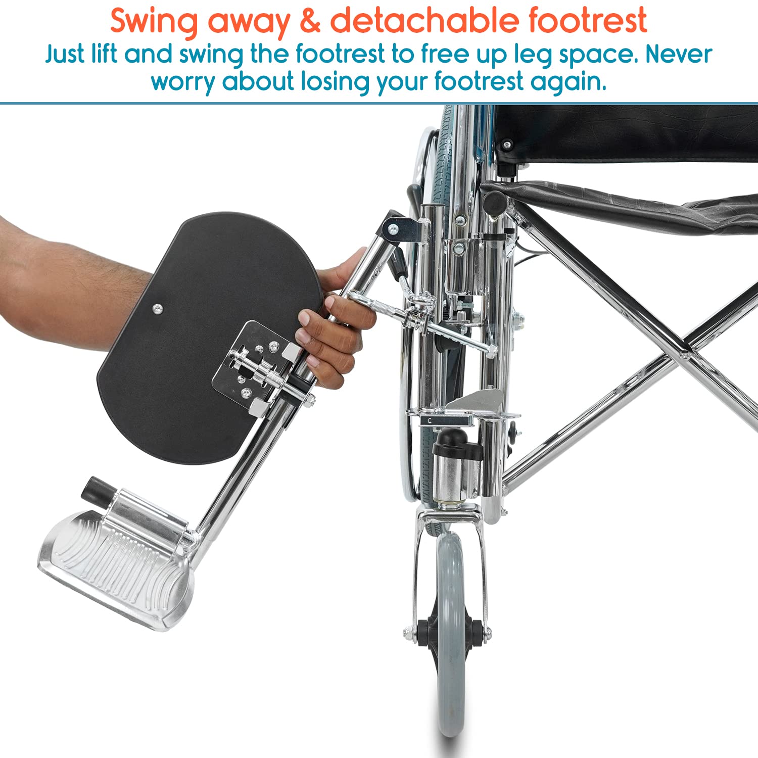 HIGH QUALITY WHEEL CHAIR: The wheelchair comprises superior quality rust-free mag wheels which increases the life span of this chair. The 24 inch rear wheels are for self manoeuvring while the solid PVC front casters swivel at 360° to improve the wheel chairs movements. The wheelchair is equipped with easy to apply brake levers for both the attendant and the user.