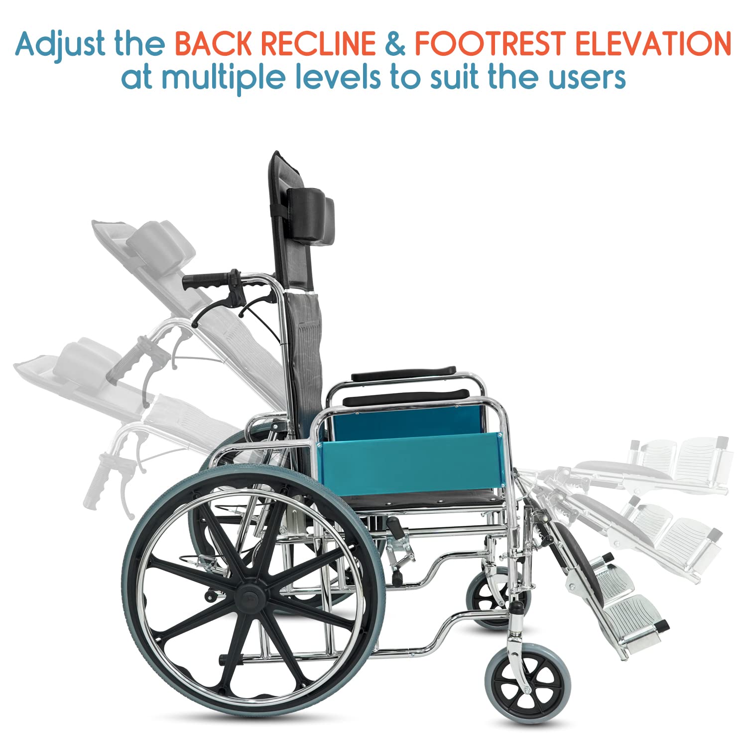 STRONG & DURABLE FRAME: KosmoCare recliner wheelchair is made of heavy-duty steel for rigorous use. Steel frame adds extra durability and stability to the chair while the MS chrome plated ensures extra strength, longevity. The steel frame provides a high load-bearing capability up to 100 kgs.