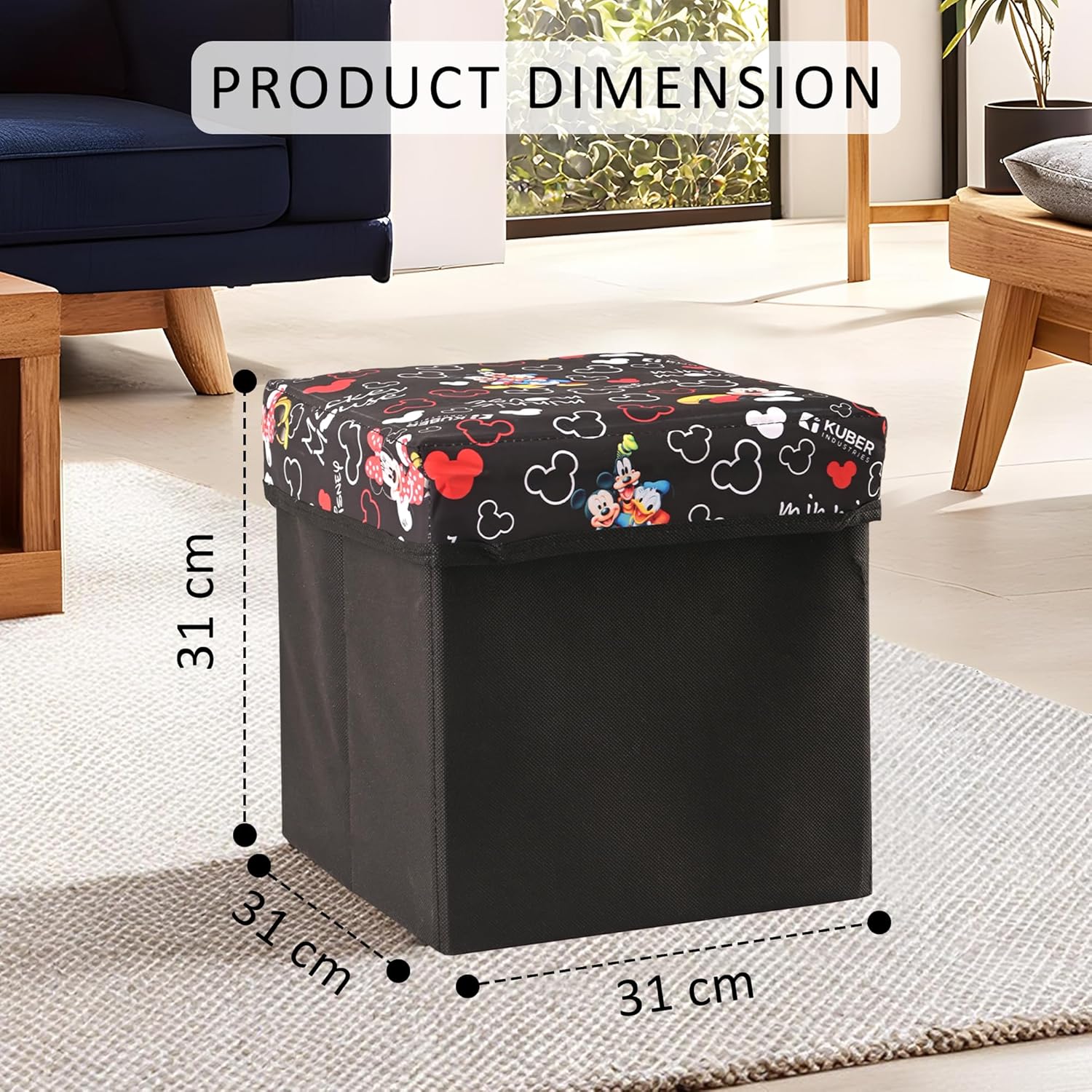 Kuber Industries 22L Folding Seating Stool | Sitting Stool for Living Room & Bedroom | Storage Stool for Footrest, Dressing Table | Sofa Stool And Bedside Table with Storage | Disney Team | Black